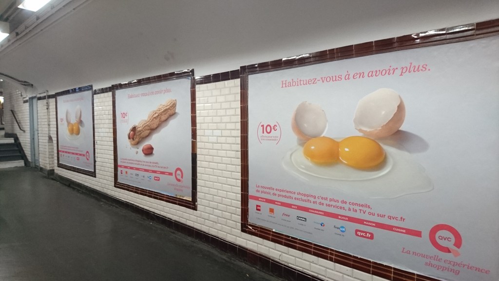 Illustrant cette sommation, une seule coquille d’œuf, cassée, mais laissant sortir deux jaunes… ou bien, ailleurs, une coque d’arachides, comportant au moins cinq graines et non deux… À en croire cette publicité distrayant le parisien s’engouffrant dans le morne métropolitain, on nous prépare à l’œuf et l’oléagineux augmentés. Ce site marchand, pour lequel est affichée cette image photoshopée, trouve à l’évidence que nous n’avons pas assez d’ustensiles de cuisine, de fanfreluches décorant notre chez-soi, de parures de bijoux, de toilettes vestimentaires, ni de crèmes nous rendant belles. « Habituez-vous » est écrit en police verticale, telle un oukase imposé par le destin qui s’emballe follement. « à en avoir plus » est écrit en italique, plus doux, transformant l’ordre impérieux en une suave invitation. Les publicistes sont des virtuoses de la subtilité.