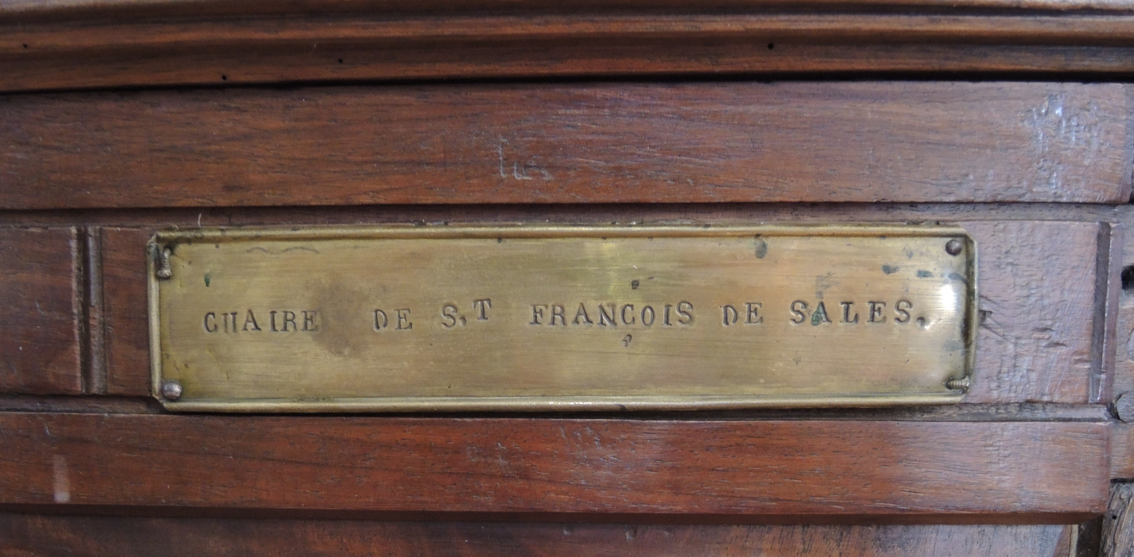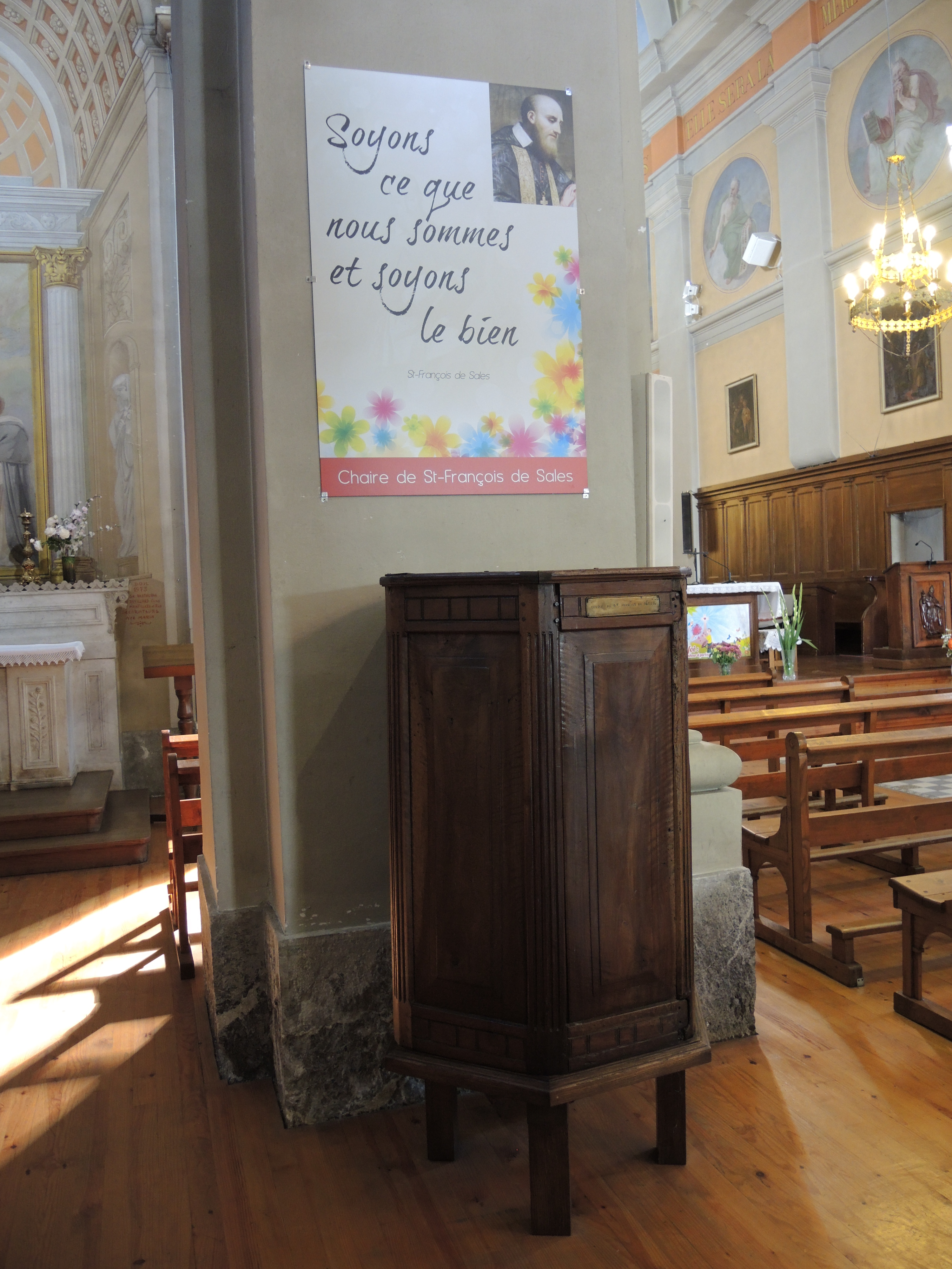Sur le bas-côté nord, se trouve cette chaire où a prêché saint François, telle une relique, mais surtout telle une invitation à lire ses écrits, à lire sa vie et à le suivre dans la reconquête du Chablais. Car partir d’ici est symbolique. Pour comprendre, montons aux châteaux !