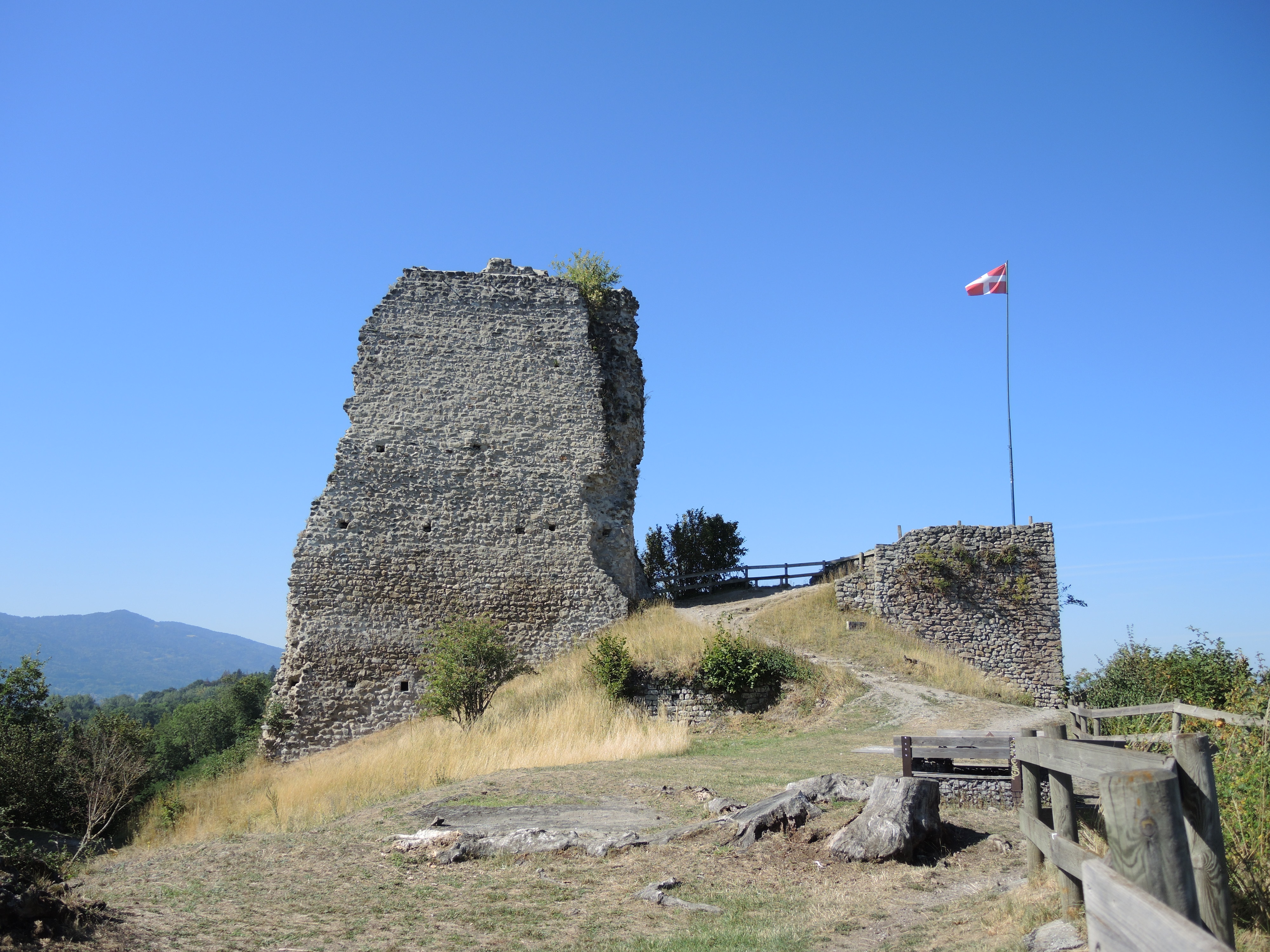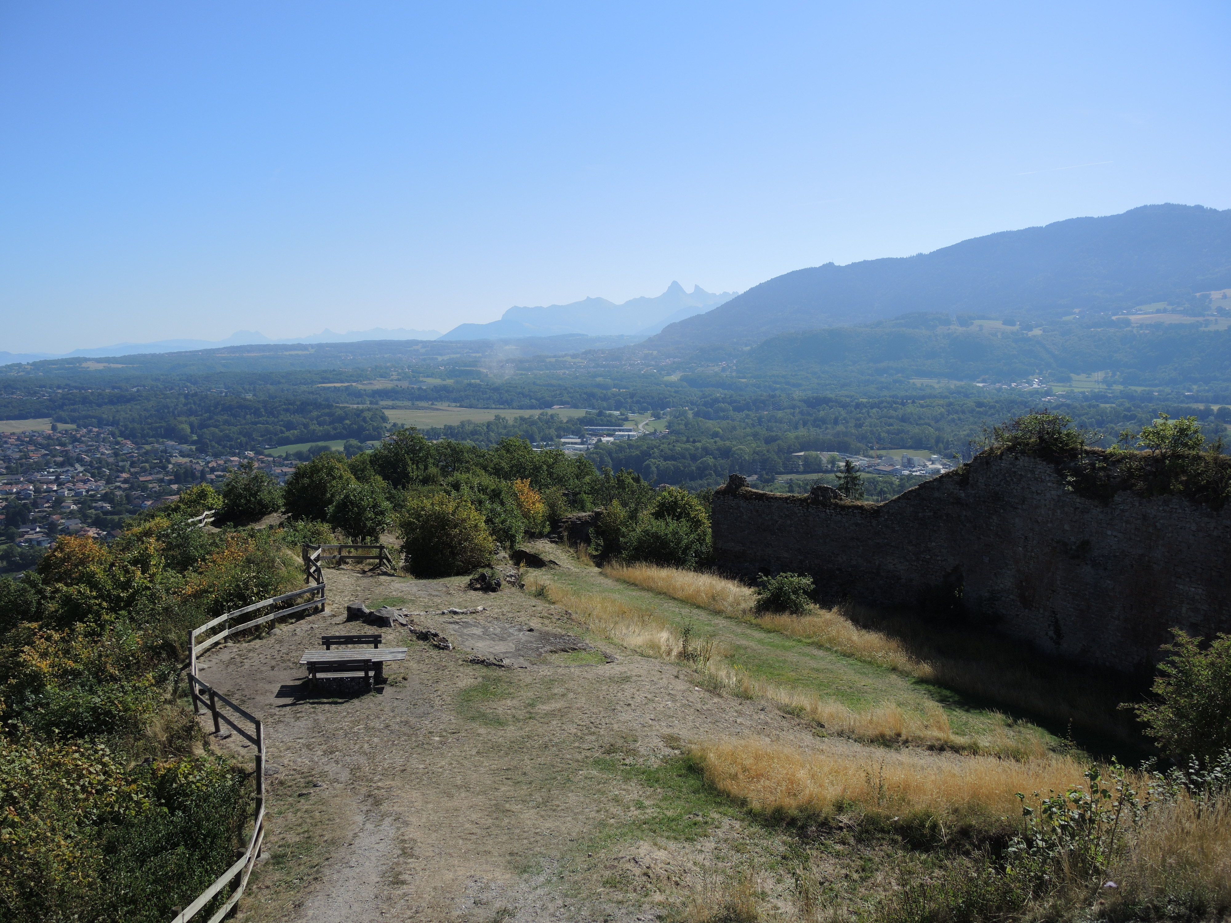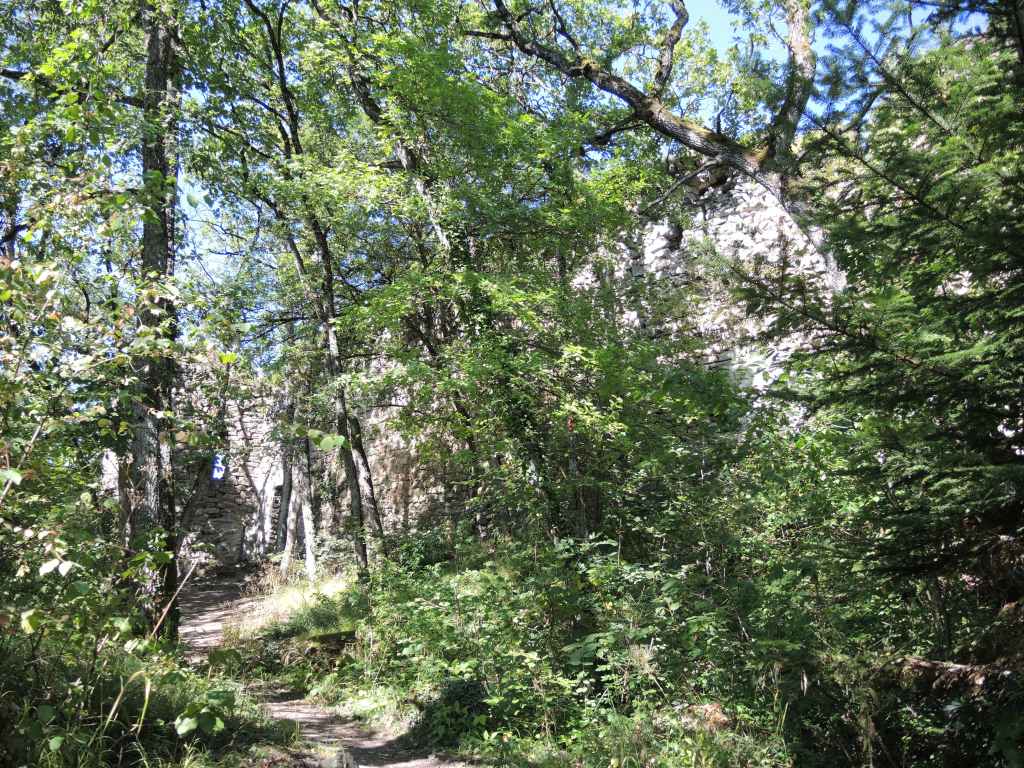 Je longe d’abord la route principale qui traverse le village et m’échappe rapidement à droite par un large chemin qui mène à un promontoire dominant Thonon et le Léman. Une première ruine apparaît derrière le feuillage dense.
