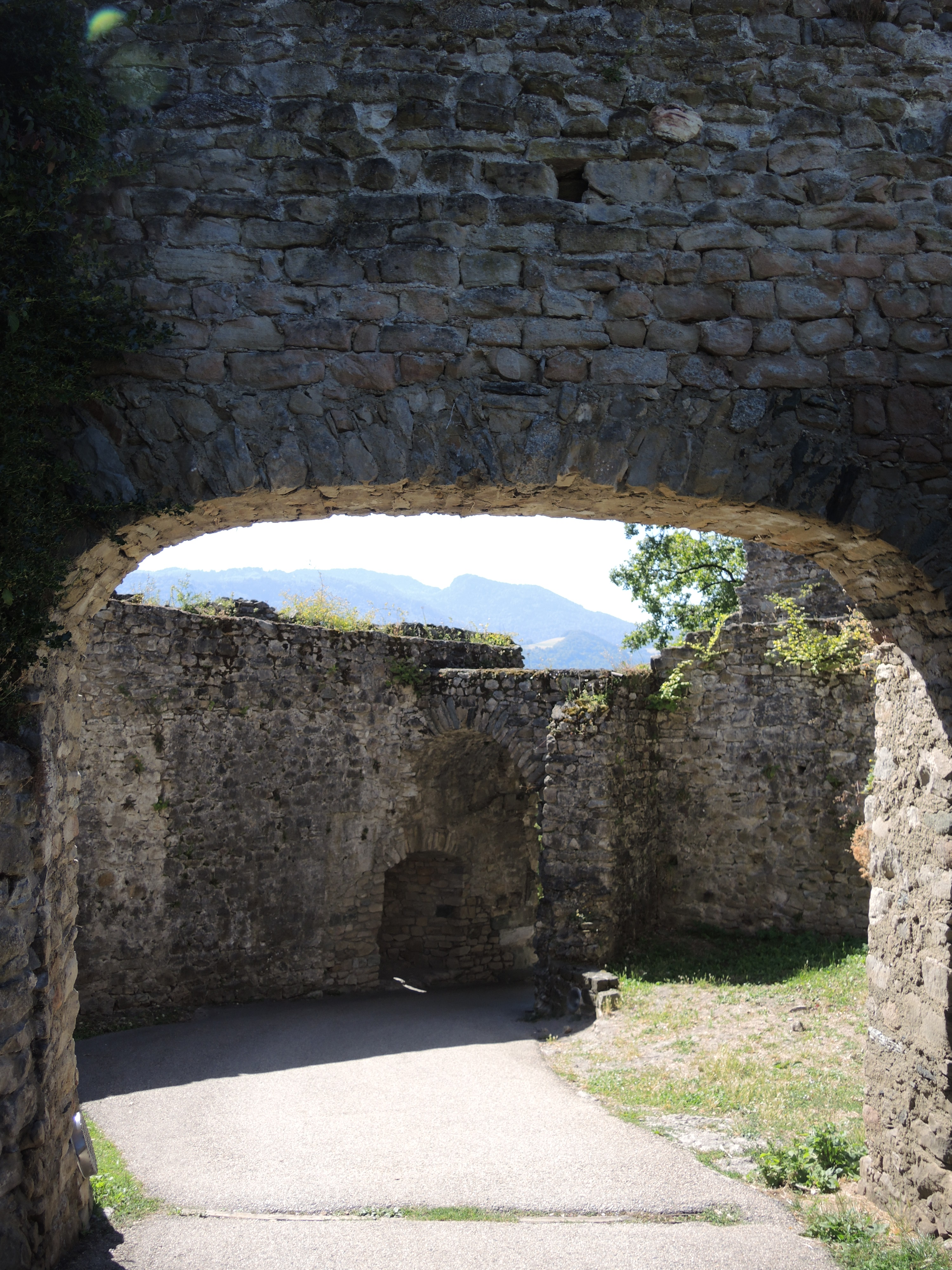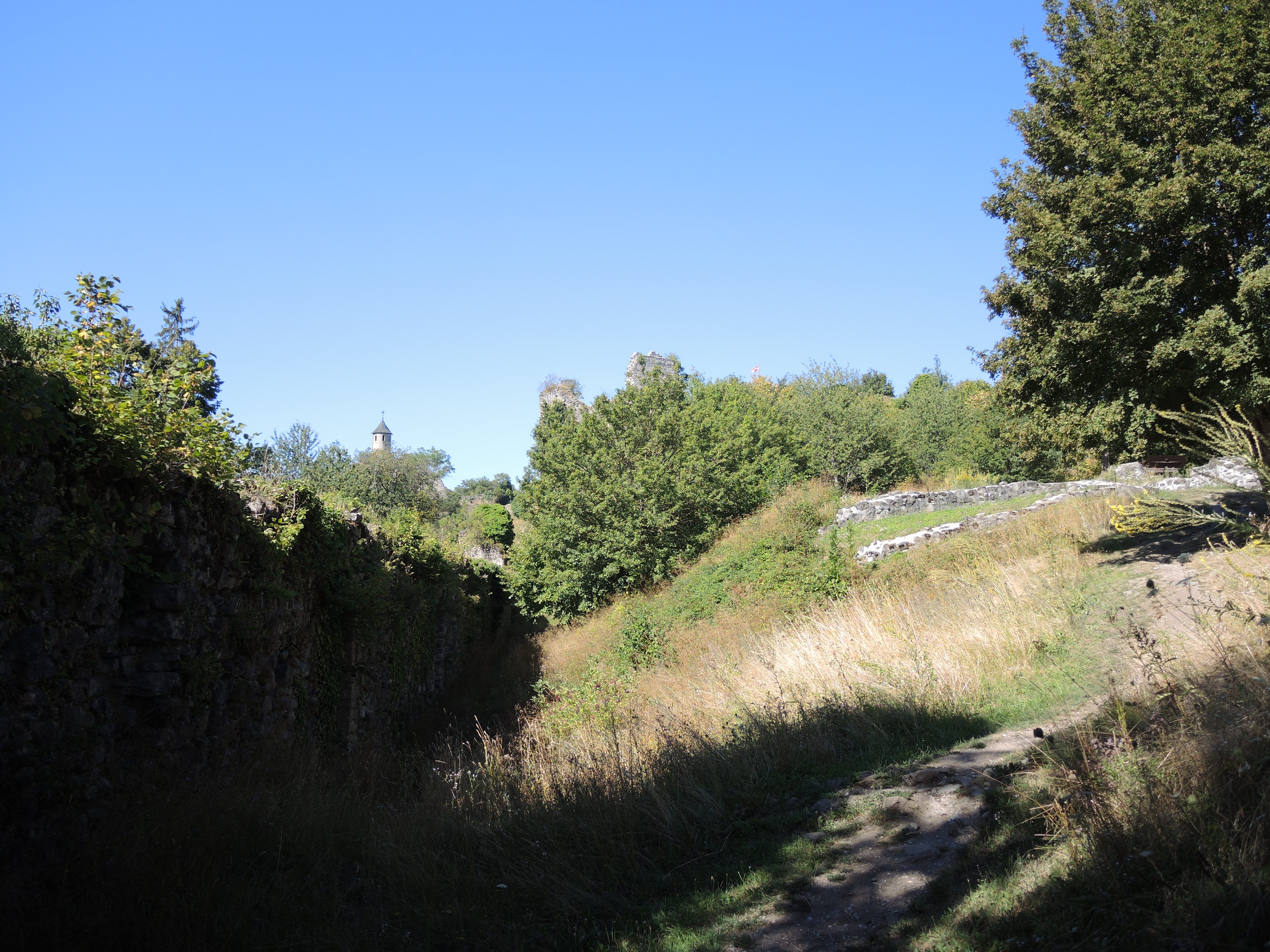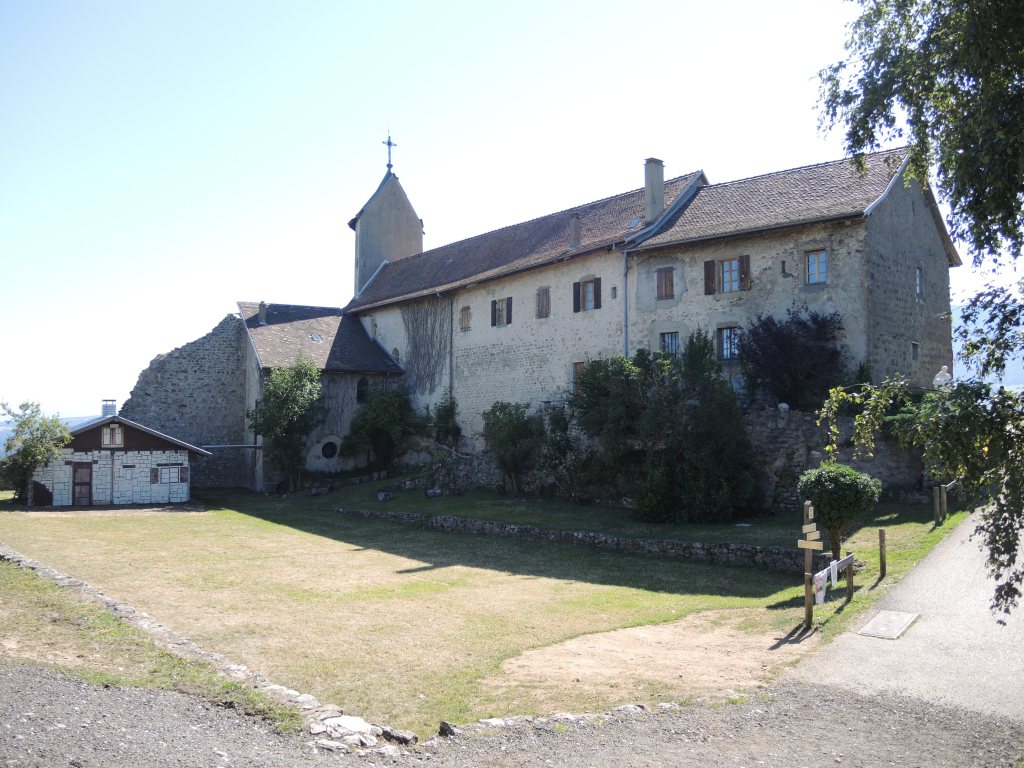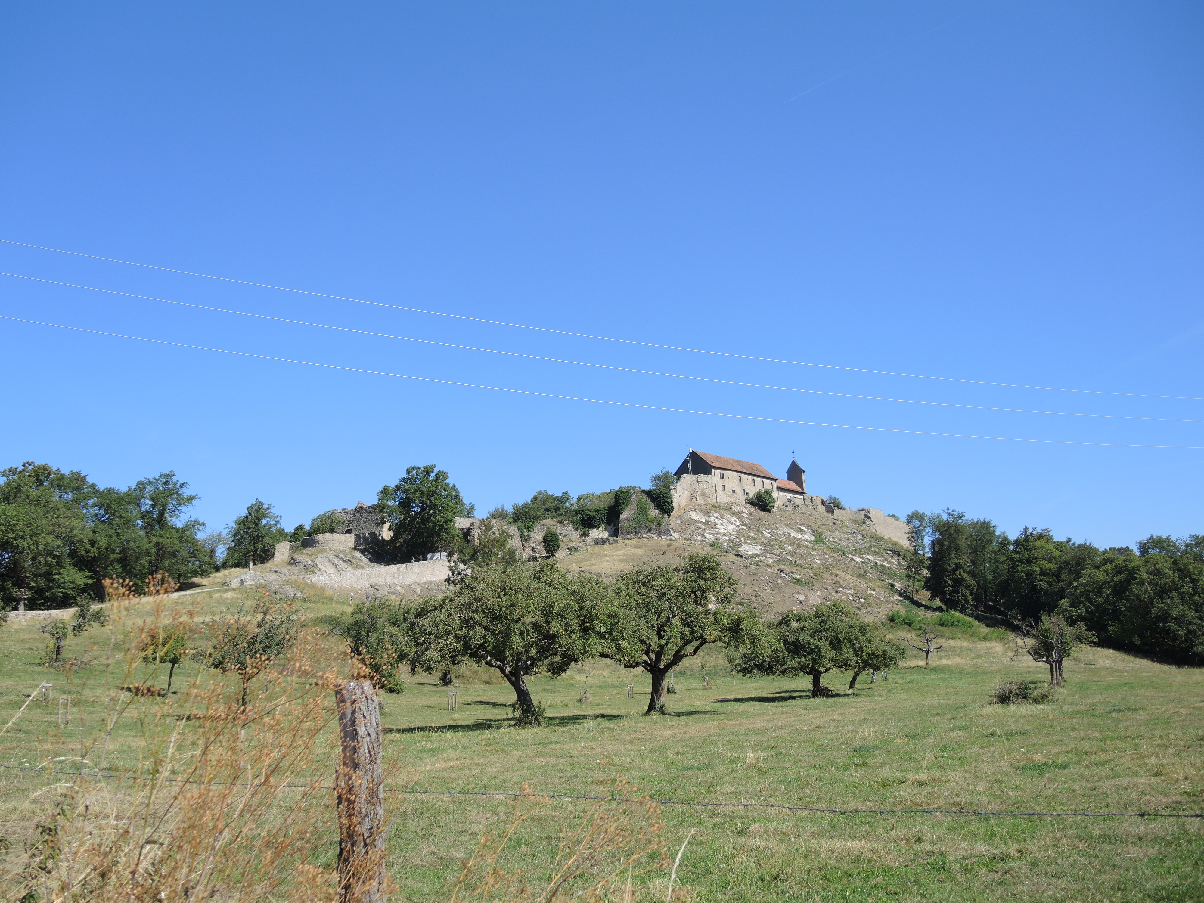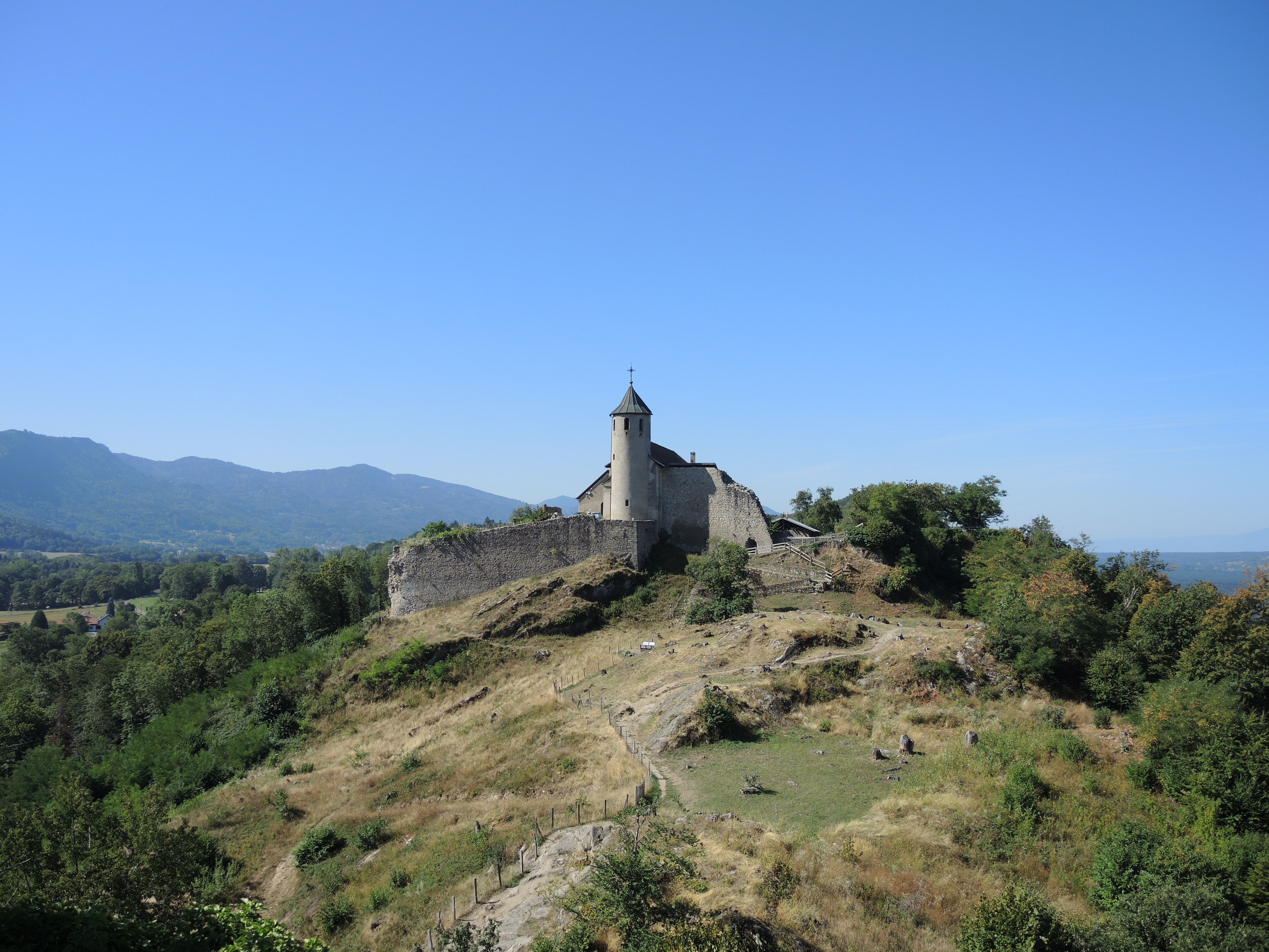 Les panneaux expliquant l’histoire et l’architecture de ce château permettent d’imaginer ce qu’il fut, malgré les doutes que les historiens n’ont pas su lever. L’on y retrouve les éléments classiques des châteaux forts : la tour seigneuriale, le bourg castral, la haute cour, la chapelle, des poternes… La végétation a tout envahi, mais la vue reste dégagée vers le lac et l’on aperçoit en contre bas l’église d’où je viens.