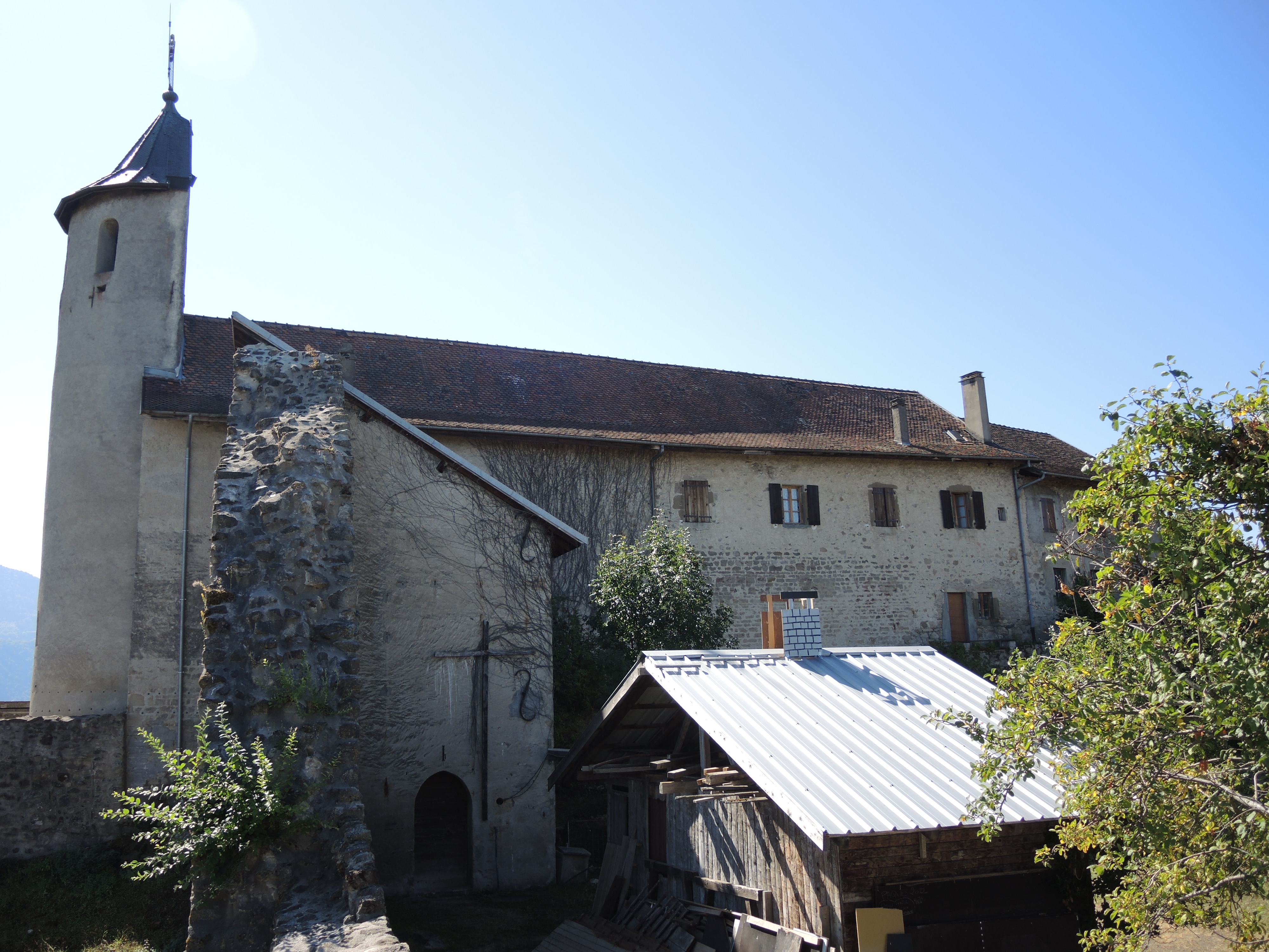 C’est à y perdre son latin, tant je ne comprends rien à l’architecture du bâtiment qui s’offre à moi. Une pancarte, heureusement, explique comment démantèlements, remaniements et restaurations donnent, dans l’empilement des siècles, l’agencement actuel : « Démantelé en 1703 sur les ordres du duc de Savoie, le site de Château-Neuf est aujourd’hui peu compréhensible sans analyse approfondie. […] Restauré et remanié au XIXème siècle par les missionnaires de Saint-François-de-Sales, [ce qui reste de l’ensemble] abrite la chapelle du château (« castrale »). Cette chapelle a conservé l’essentiel de son architecture romane, malgré sa restauration en 1836. Une tour semi-circulaire, construite à la verticale du chœur en 1280-1281, protégeait le front nord [pendant le siècle d’affrontements]. Aujourd’hui, l’enceinte et le bâtiment attenant ont partiellement disparus. Cette demi-tour ronde y gagne l’allure d’un clocher atypique. »