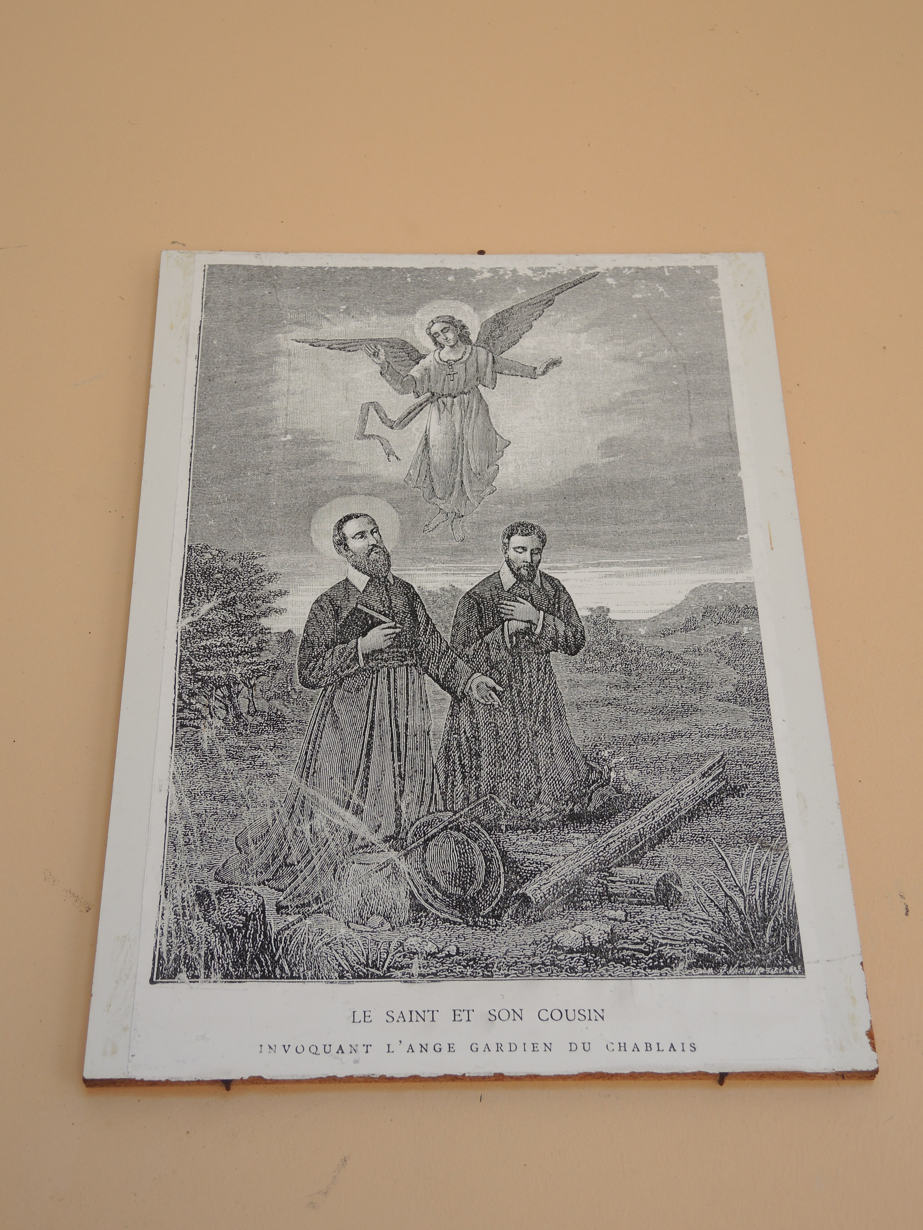 Les deux prêtres passent la frontière du Chablais, où un ange leur serait apparu pour les conforter et réconforter. Cette scène est plusieurs fois représentée dans l’art : à gauche dans l’église d’Allinges, à droite dans le Château-Neuf.