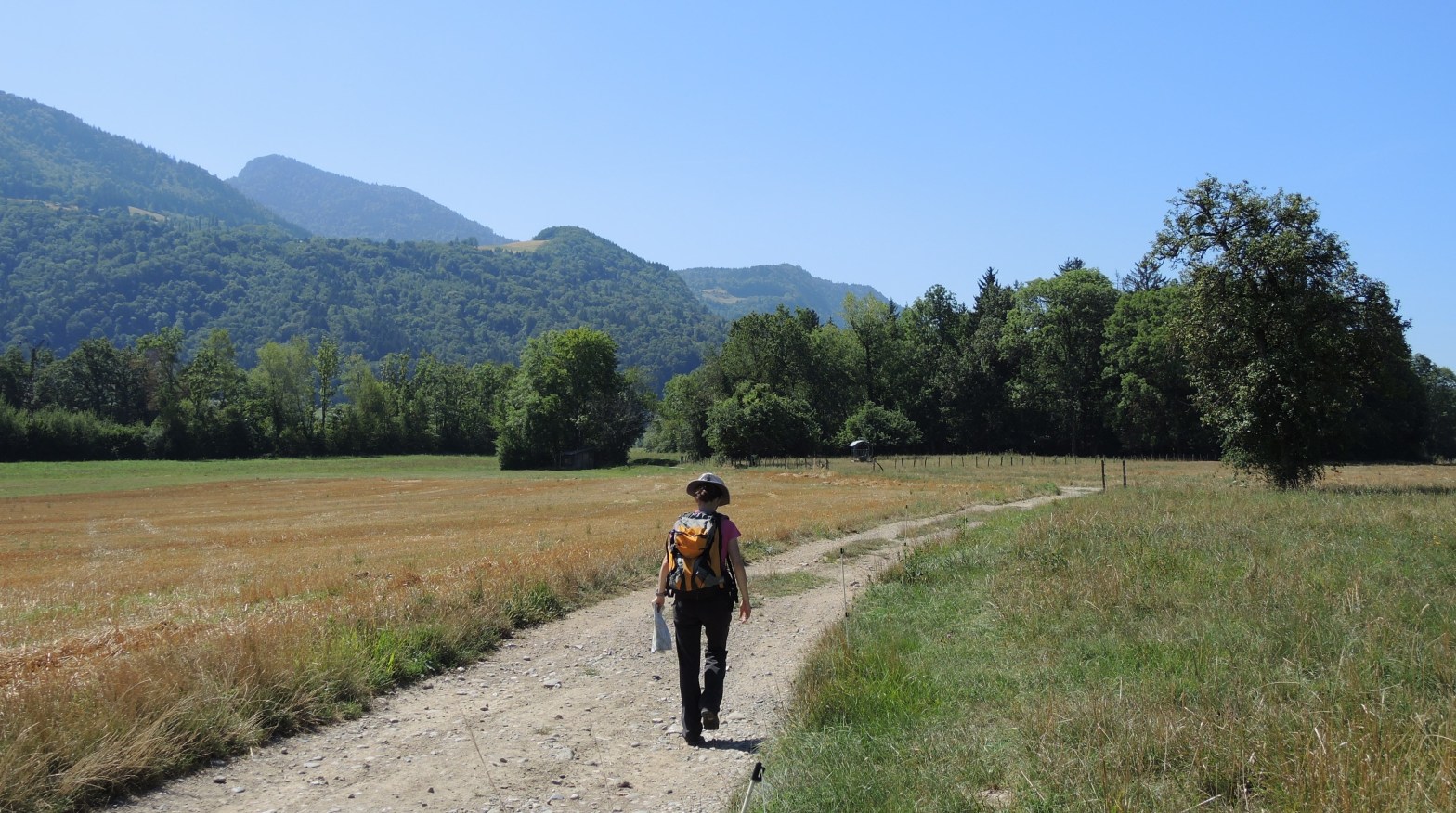 Allinges rapetisse peu à peu à l’horizon, mon chemin s’étire dans une agréable campagne. Je savoure sa sérénité et sa douce chaleur estivale. Je goûte longuement dans l’action de grâce ce départ tant attendu, tant espéré depuis plus de dix ans. C’est aujourd’hui mon deuxième « premier jour ». Je repense au jour 1 de Québec-Mexico et m’aperçois qu’aujourd’hui n’a rien de l’ambiance des grands départs lointains pour le long cours. « Commencez petit ! » m’avait dit une amie. Aux États-Unis, mon look de baroudeuse intriguait et l’on venait vers moi facilement. Ici, le marcheur fait légion et je passe inaperçu. Ce modeste anonymat me semble de bon augure.