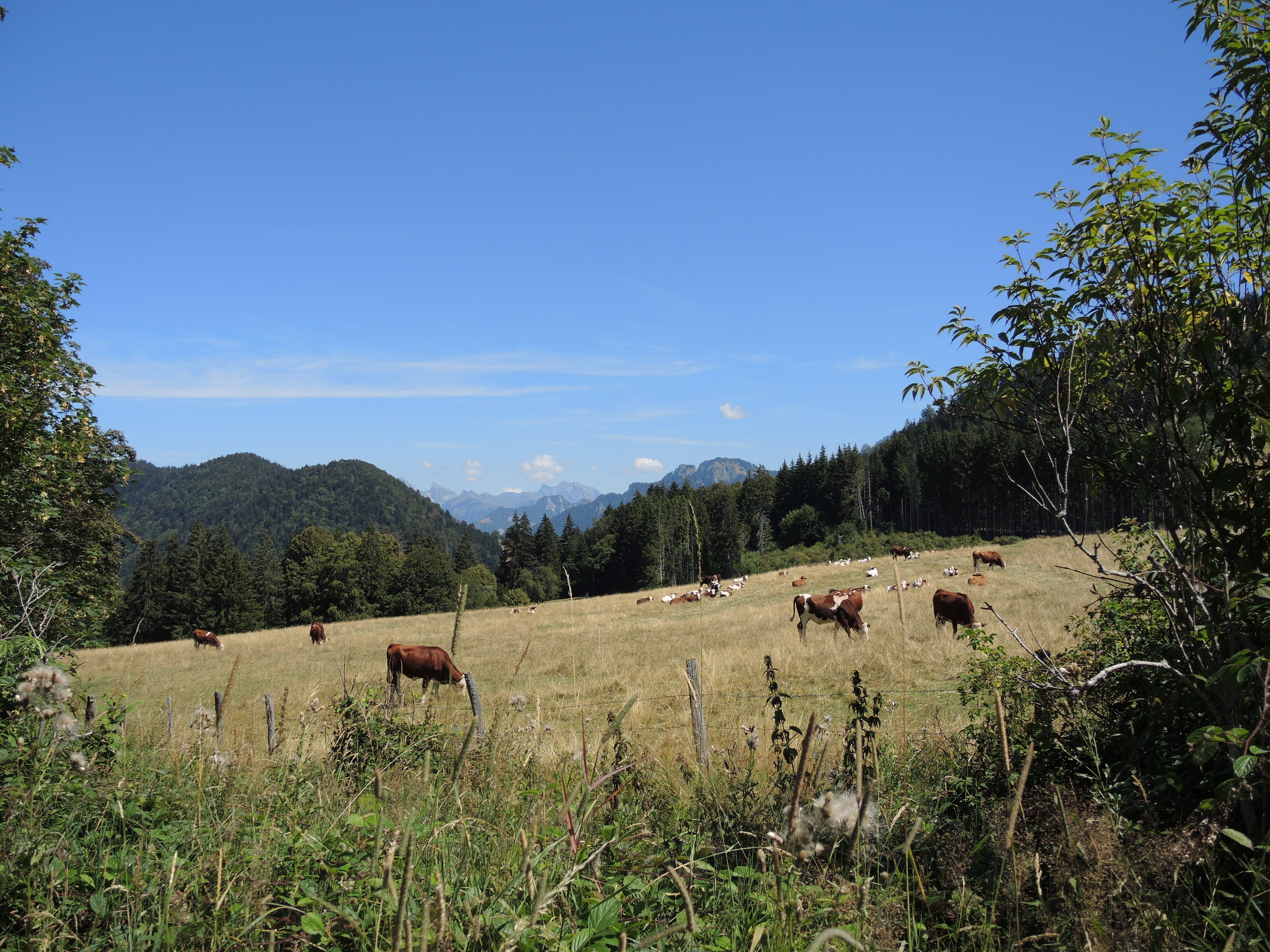 Je sors de mon bois sombre et arrive à un alpage fréquenté, non par des meutes hurlantes, mais par deux troupeaux : les vaches et les touristes. Je m’approche du Mont Forchat et, naïvement, je me dis que tous ces randonneurs montent aussi vers la statue de saint François. Je trace quand, soudain, une dame tirant un drôle de charriot en haletant m’appelle :