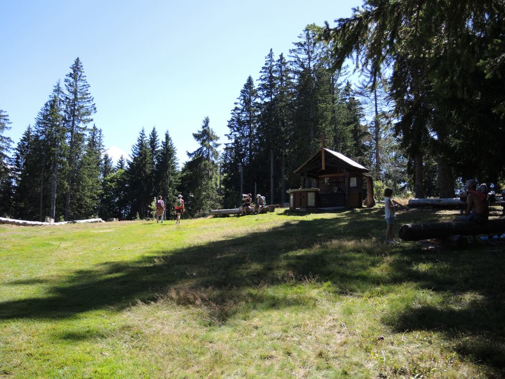 Rapidement, j’arrive à une clairière où est bâti un oratoire en rondins de bois où sont célébrées les messes de pèlerinage en juillet.