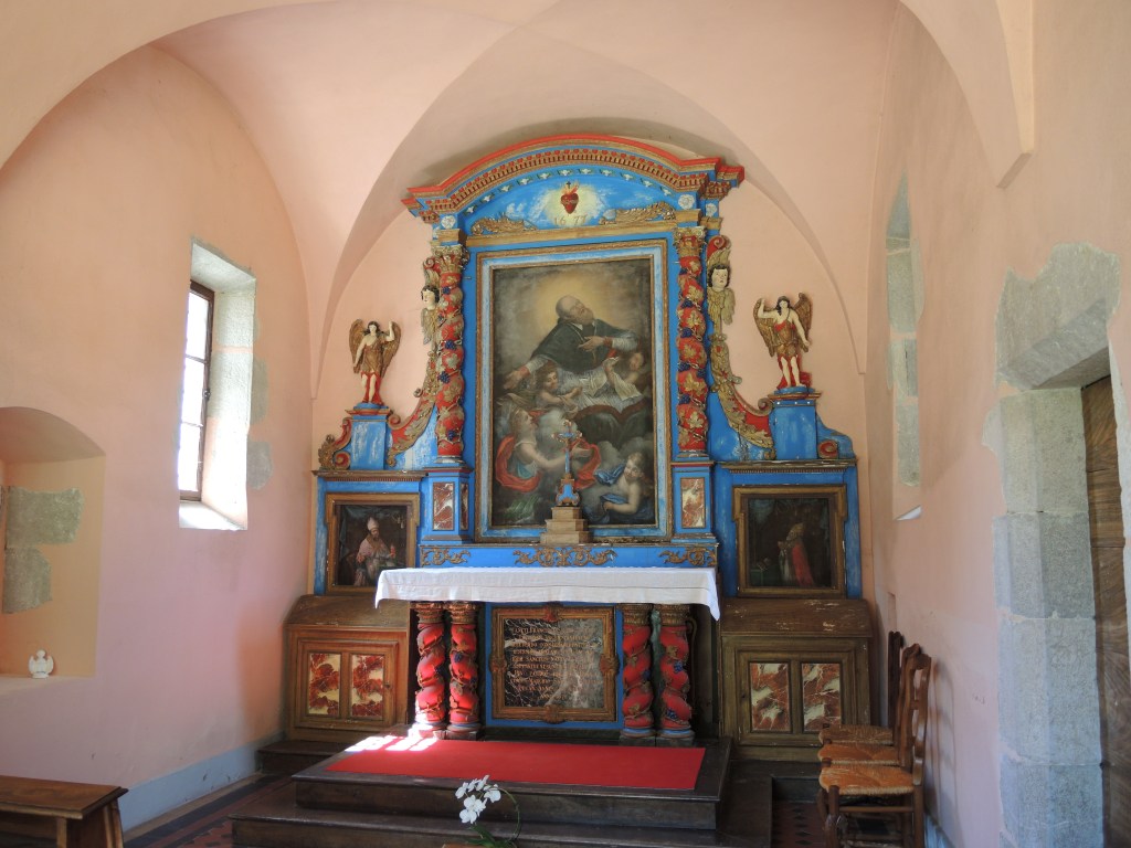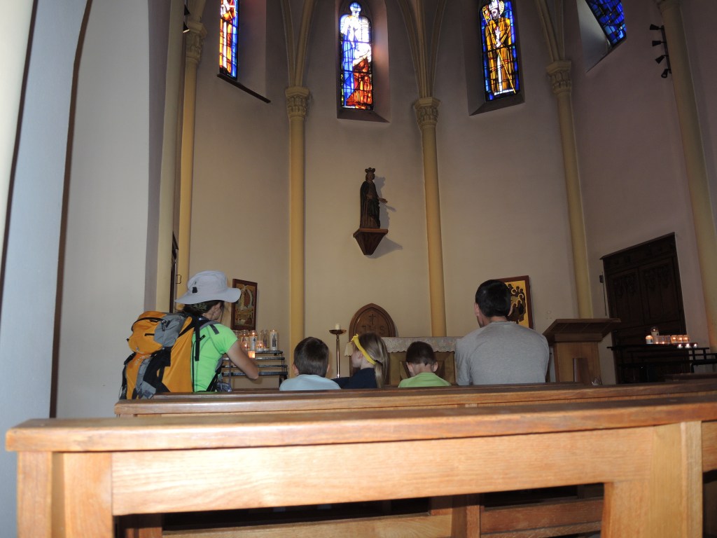 Un Notre Père et un Je vous salue, Marie avec les enfants dans la chapelle de La Fontaine Bénite, une visite à la source en bas et je pars.