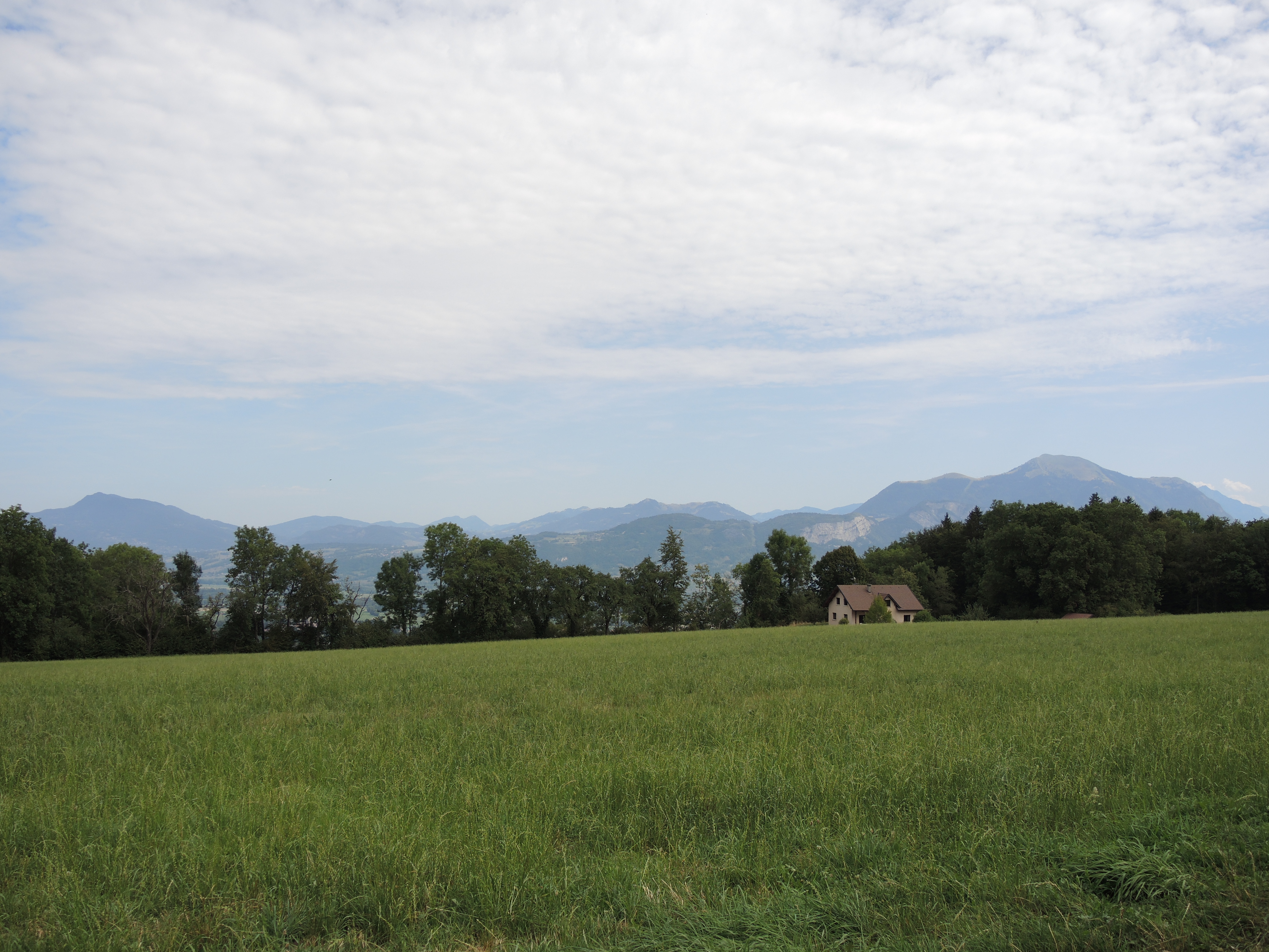 Très vite le terrain ne ressemble plus à la carte et je navigue à vue entre la voie ferrée, des ruisseaux taris, des chemins censés ne pas exister, des sentiers censés exister. Mais peu à peu, je m’élève au-dessus de La Roche-sur-Foron, du Genevois et de la vallée de l’Arve. La campagne est calme.