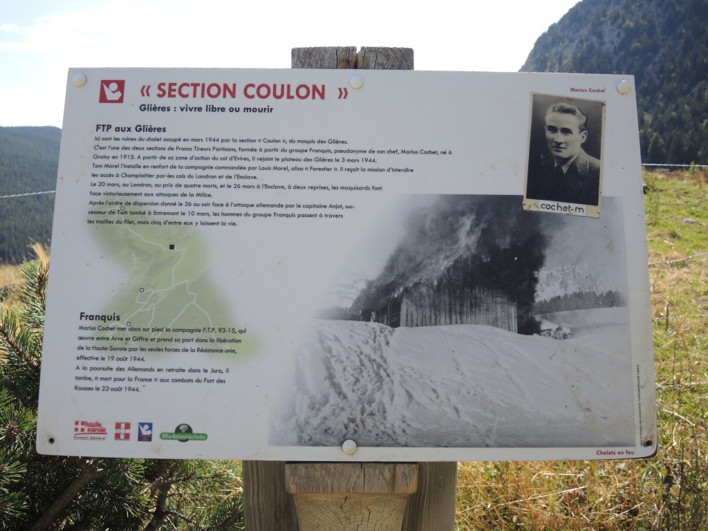 Ce chalet, désormais en ruine, était occupé par la section « Coulon » commandée par Marius Cochet. Tom Morel lui avait donné mission d’interdire les accès à Champlaitier par les cols du Landron et de l’Enclave. Les 20 et 26 mars, ils résistèrent aux attaques de la milice, collabos français. Marius Cochet tombera « pour la France » dans le Jura, à la poursuite des Allemands, le 22 août 1944. Glorieuse France qui résiste au prix de la vie.
