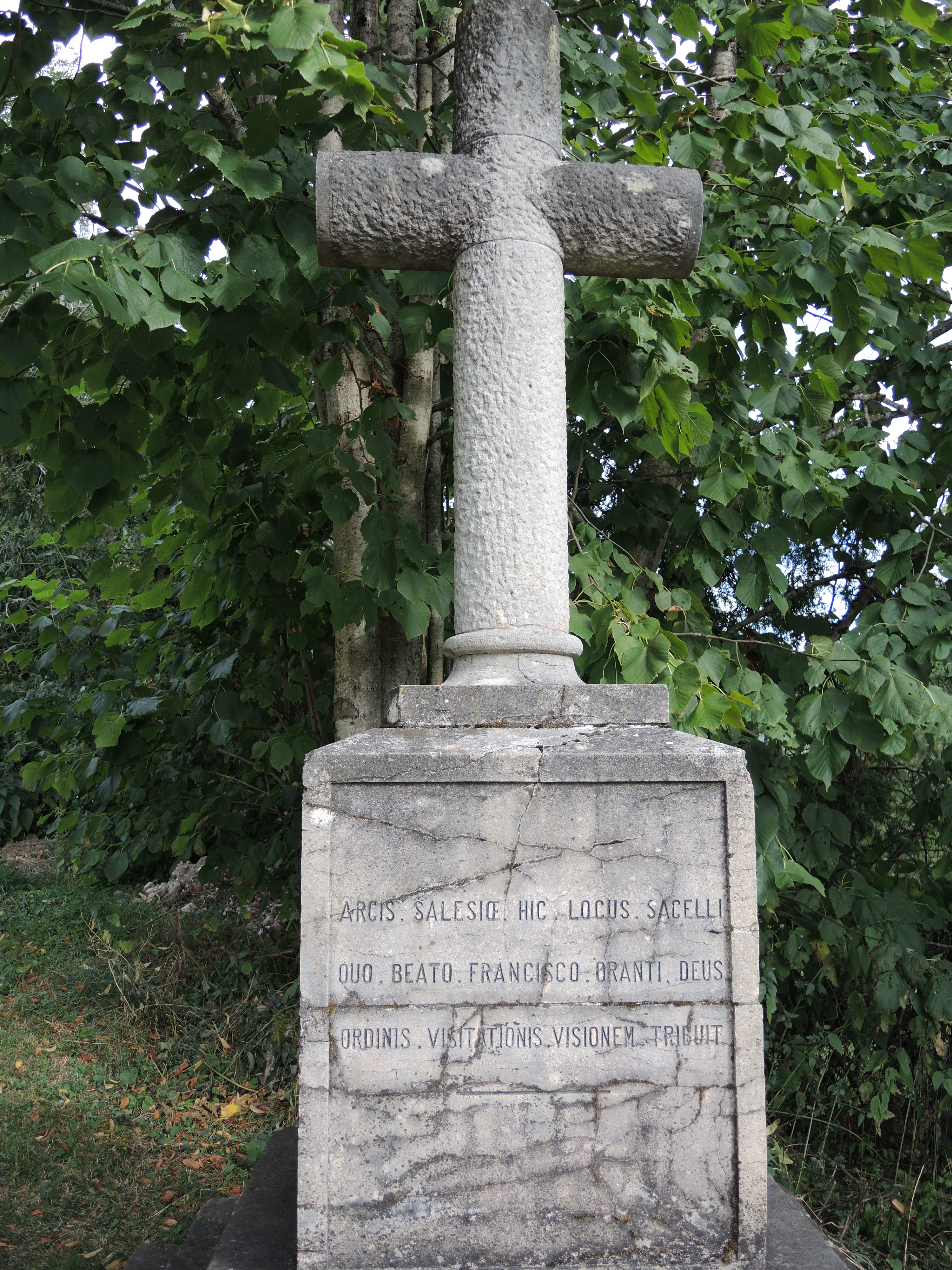 J’arrive donc dans le fief de la famille de Sales, la terre natale de notre saint François (1567-1622). Nous ne sommes pas en France ici, aux XVI et XVIIèmes siècles. Et comme aux Allinges, il va encore être question de deux châteaux distants seulement de quelques centaines de mètres. Le château de Sales, celui dans lequel est né François, n’existe plus. Déjà incendié en 1617, il sera de nouveau pillé et brûlé en 1630 par les troupes de Louis XIII, ces affreux français ! Or, ce vieux manoir étant jugé vétuste par Monsieur de Boisy, le père de François, celui-là entreprit dès 1551 d’acquérir un autre château, juste en contre bas : l’actuel château de Thorens. Si saint François y a probablement peu séjourné, c’est lui qui signa l’acte d’achat pour le compte de ses frères et sœurs, en 1602 seulement. Il y est aujourd’hui honoré. Du château de Sales, il ne reste donc rien. Mais les neveux de notre saint construisirent en 1677 une chapelle en lieu et place de sa naissance. Et en face de cette chapelle se trouve une croix, à l’endroit où François a reçu la vocation à fonder la Visitation avec sainte Jeanne de Chantal.