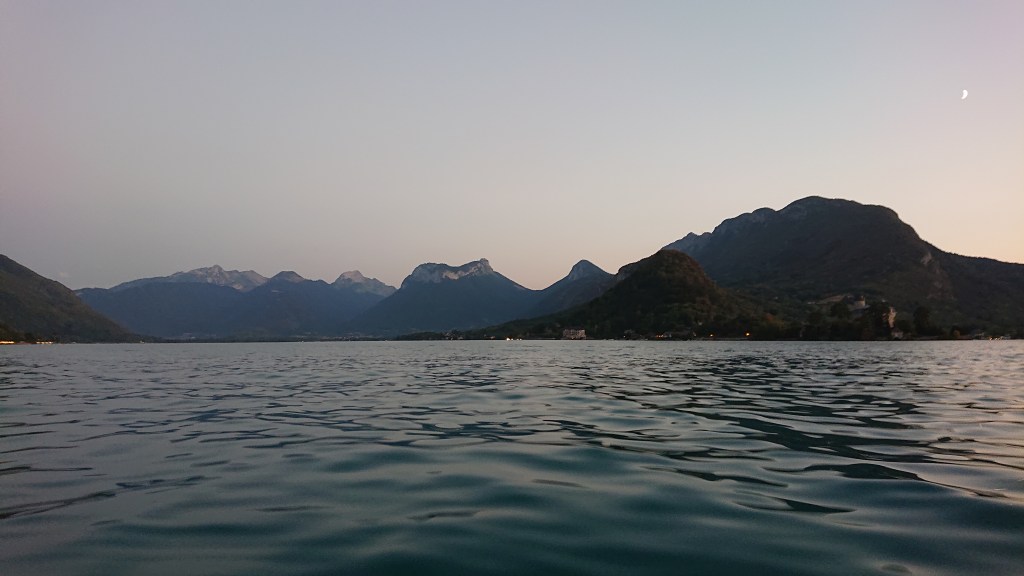 Je quitte l’ermite du XIème siècle et l’évêque du XVIIème et leur havre de paix pour retrouver Julien et les enfants à la plage de Talloires. L’herbe, encore verte et belle il y a quelques semaines, a jauni sous le soleil caniculaire. Les corps grassouillets et rôtis s’affalent à même la terre assoiffée entre deux séances de paddle. L’odeur de clope et de gaufre se mêle à la musiquette du bar chic d’à côté. Fidèle à mon obsession de l’éloignement, j’embarque mes deux garçons sur notre kayak qui se dégonfle. Mais qu’importe, au large, l’eau est pure, la lune brille, le soleil est parti se coucher, bon débarras…