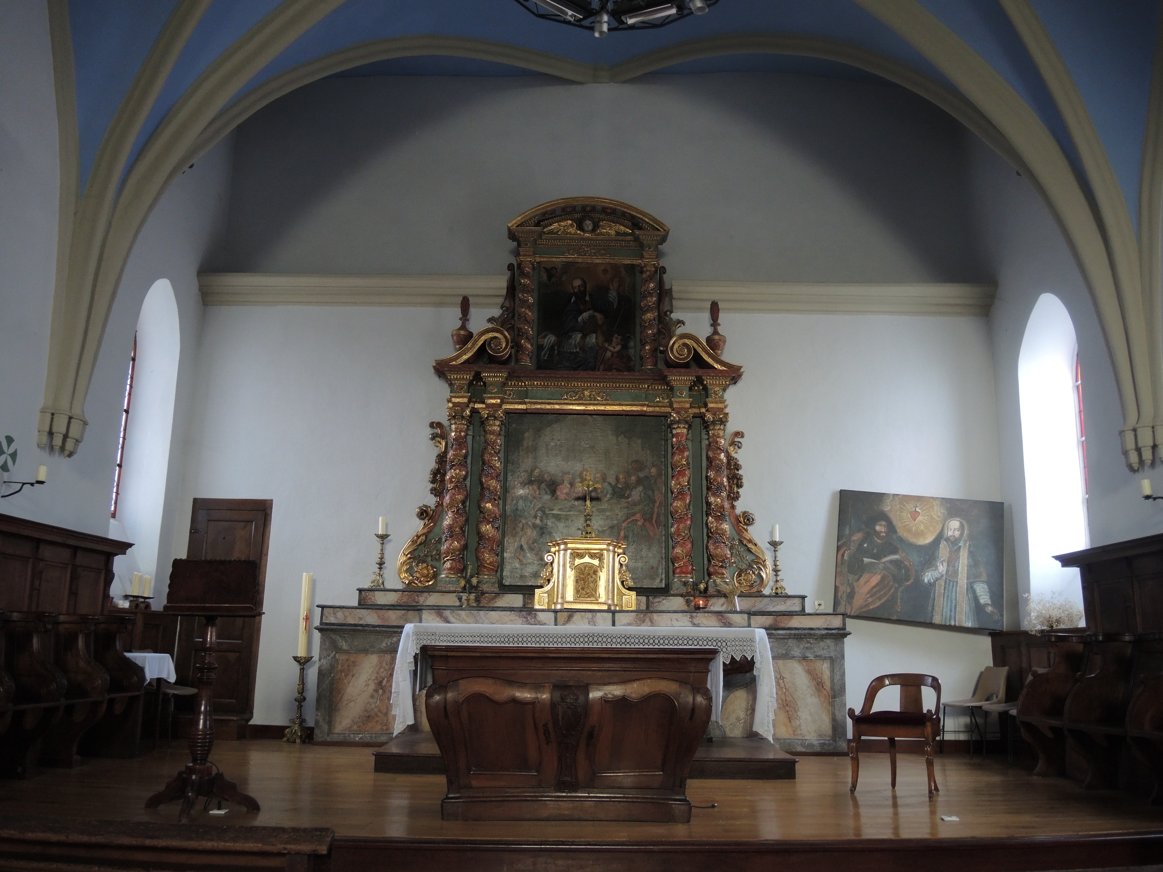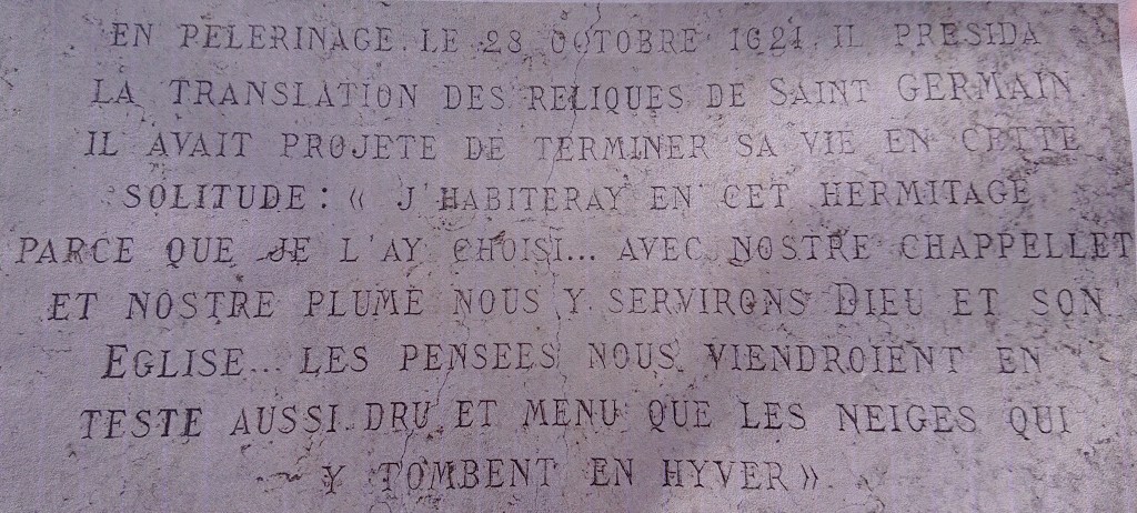 Ceux qui m’ont suivi il y a plus de dix ans dans mon périple vers Notre Dame de Guadalupe noteront qu’elle me poursuit jusque dans mes escapades savoyardes. Personne n’a su me répondre quant aux raisons de la présence de ce tableau dans cette chapelle. La châsse de saint Germain se trouve dans le transept nord. Le lien entre cet ermitage et saint François de Sales se comprend en lisant une plaque apposée à droite de la porte d’entrée de la chapelle :