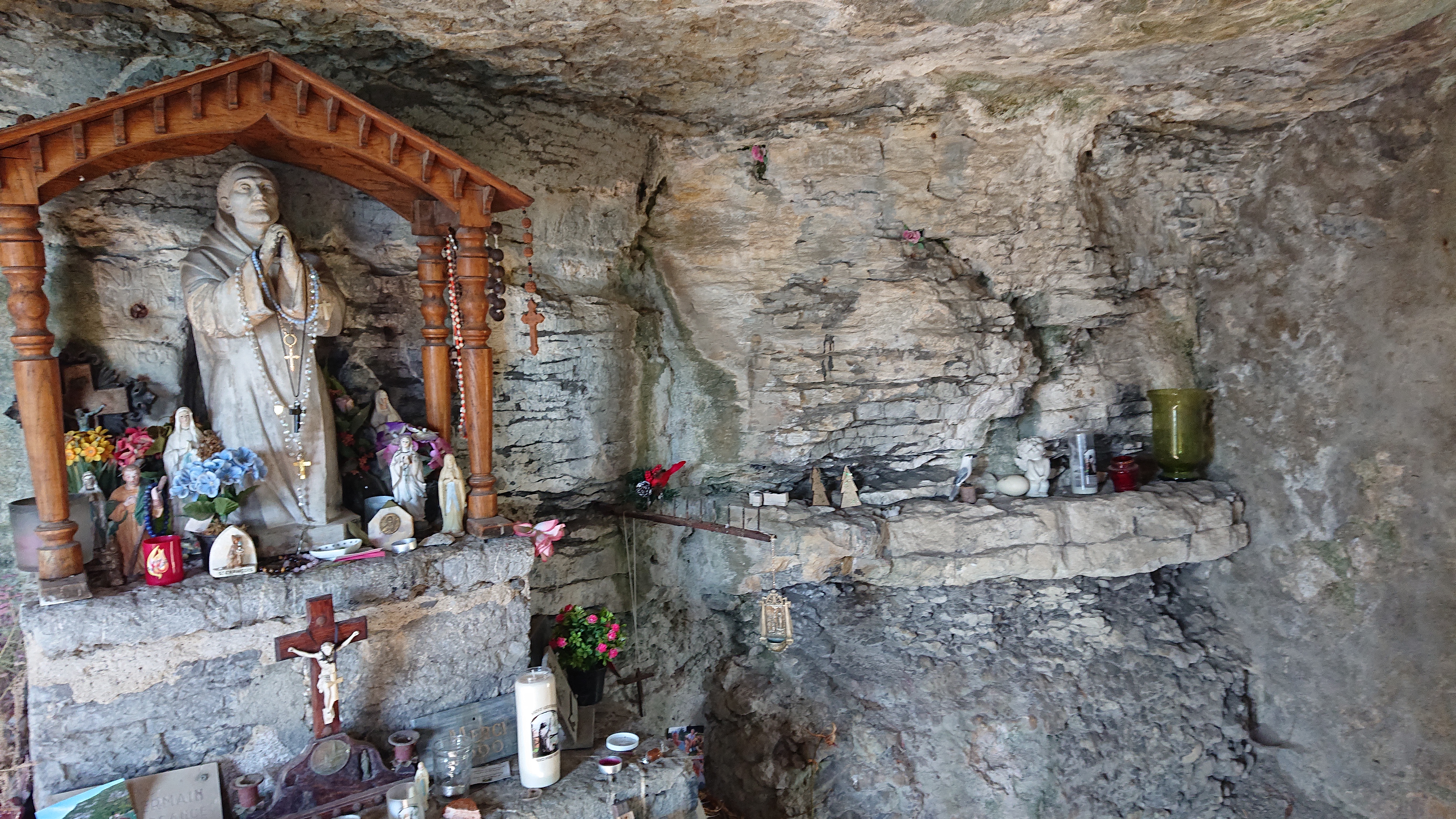 Ci-dessus, la grotte où le saint s’isolait et la vue qu’il avait sur le lac. Il descendait quotidiennement au prieuré. Ci-dessous l’actuelle chapelle. Des oblats de saint François y demeurent et animent ce lieu de pèlerinage.