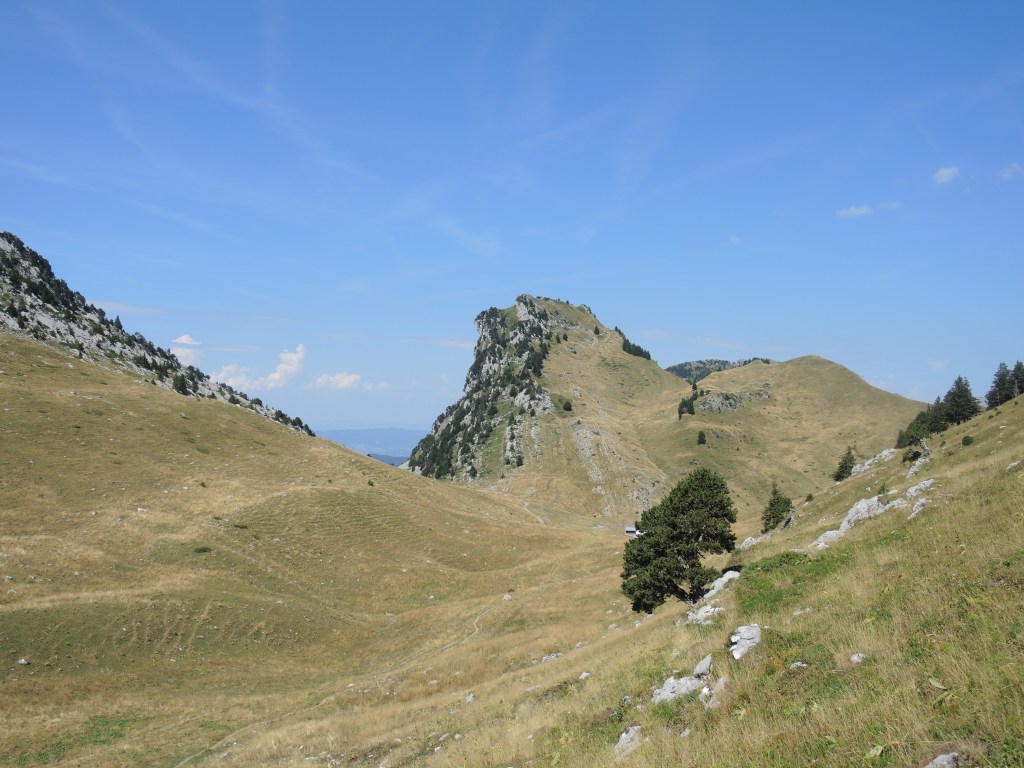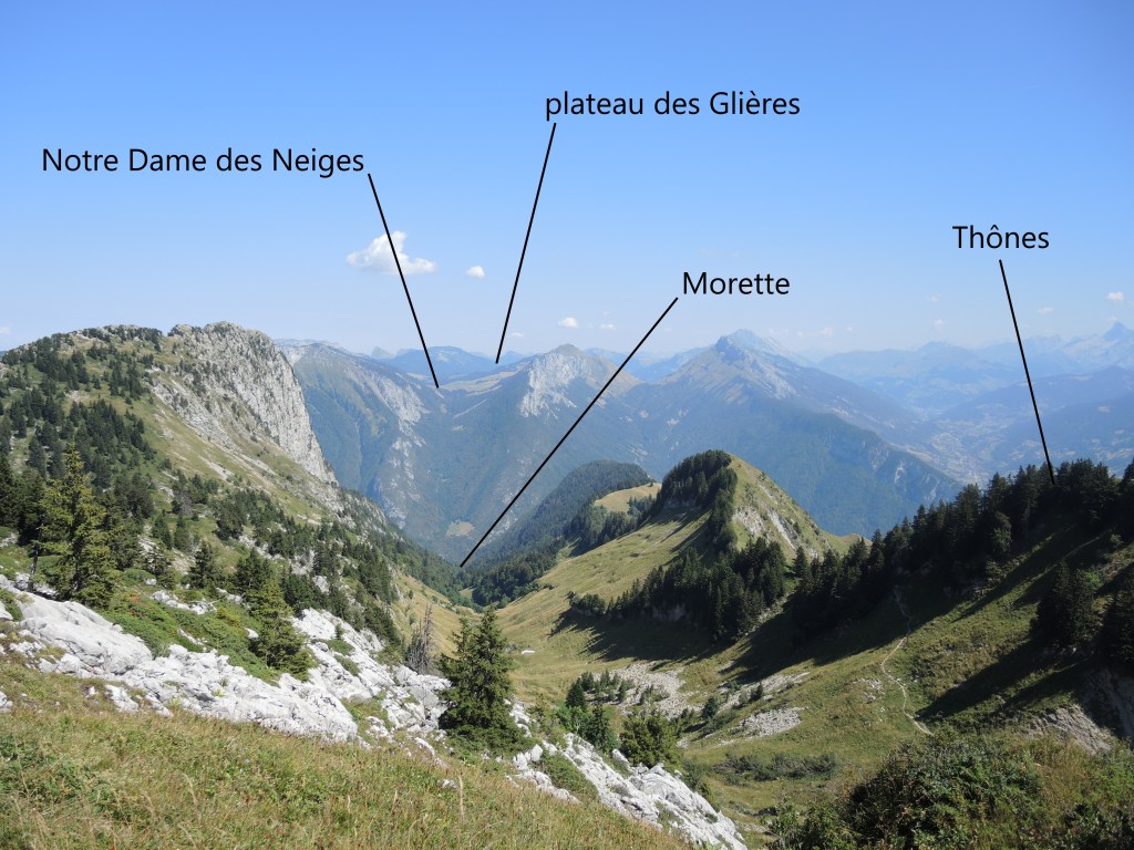 J’arrive au Crêt des Tervelles, un col. On y indique 2h30 pour Morette, en descente ! J’ai mis 2h15 pour monter ! Ma foi, c’est pas mal…