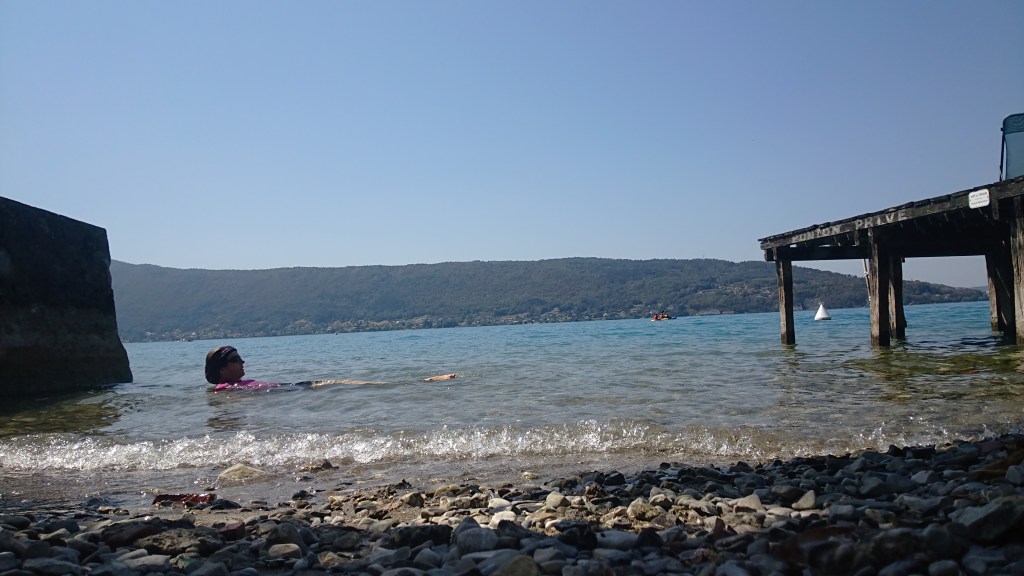 De la plage où je suis arrivée il y a deux jours, je monte au Roc de Chère après être passée devant le Père Bise, le prieuré devenu hôtel 4 étoiles, les grosses cylindrées et les beaux bateaux. Les gens ont si chaud qu’ils se baignent dans les endroits les plus improbables. Le sentier grimpe très raide sur le Roc de Chère, une réserve naturelle tombant à pic dans le lac. Le longer en kayak permet d’ailleurs de découvrir de jolies grottes à fleur d’eau… La pente s’atténue et le cardio se calme. La forêt a soif. On annonce la pluie et la fin de la canicule dans deux jours.