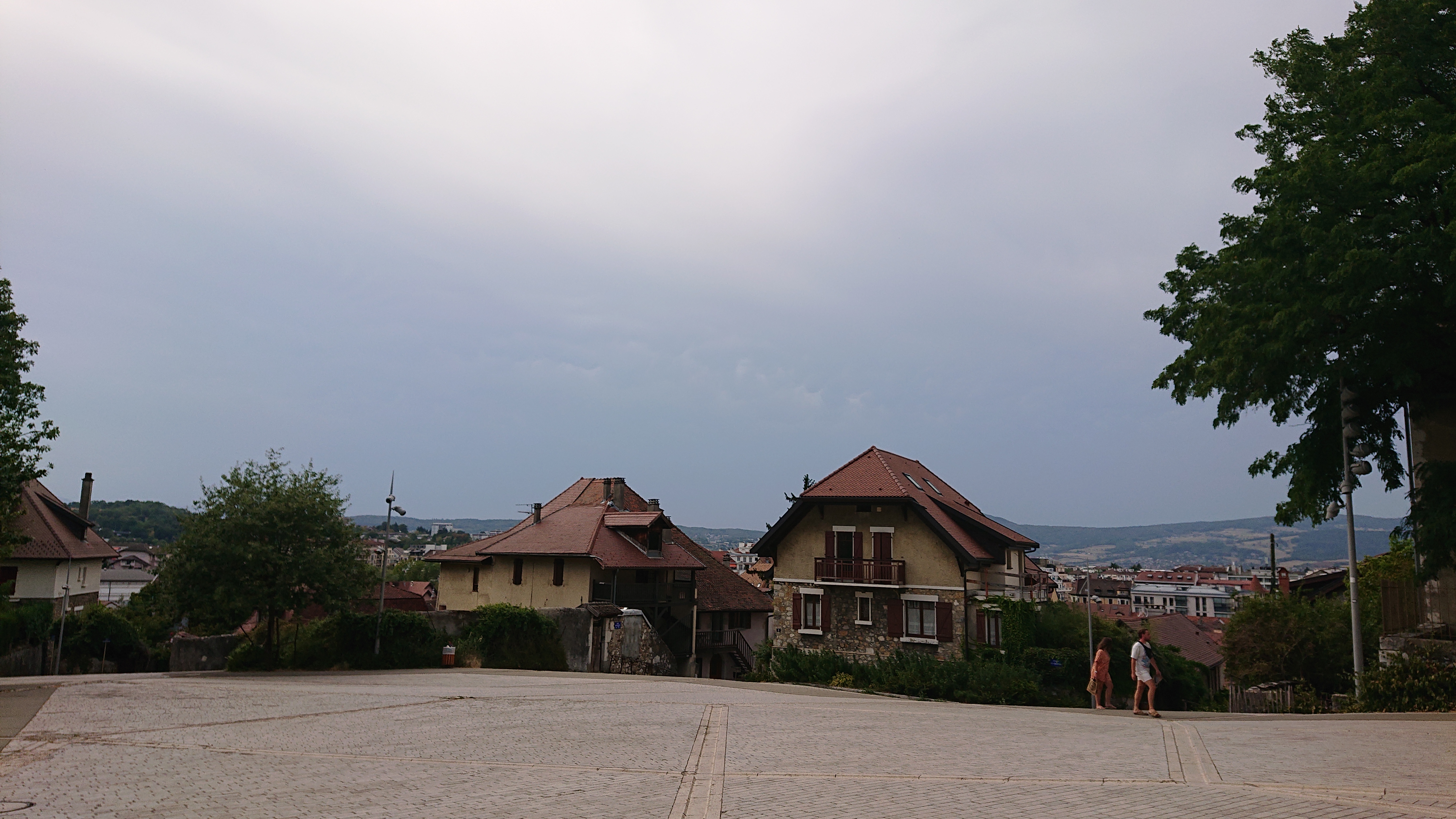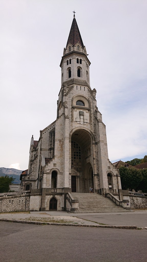 Franchir le Thiou, en montrant les poissons à Claire. Traverser l’île où se trouve l’ancienne prison, devenue l’emblème d’Annecy. Se frayer un chemin dans la rue Sainte Claire aux arcades anciennes si pittoresques. Emprunter la ruelle pavée qui monte au château massif. Apercevoir le clocher de la basilique. Tels sont les derniers mètres de ce pèlerinage. Au nord ouest, des nuages annonciateurs d’orages, de pluie et de dégringolade des degrés celsius.
