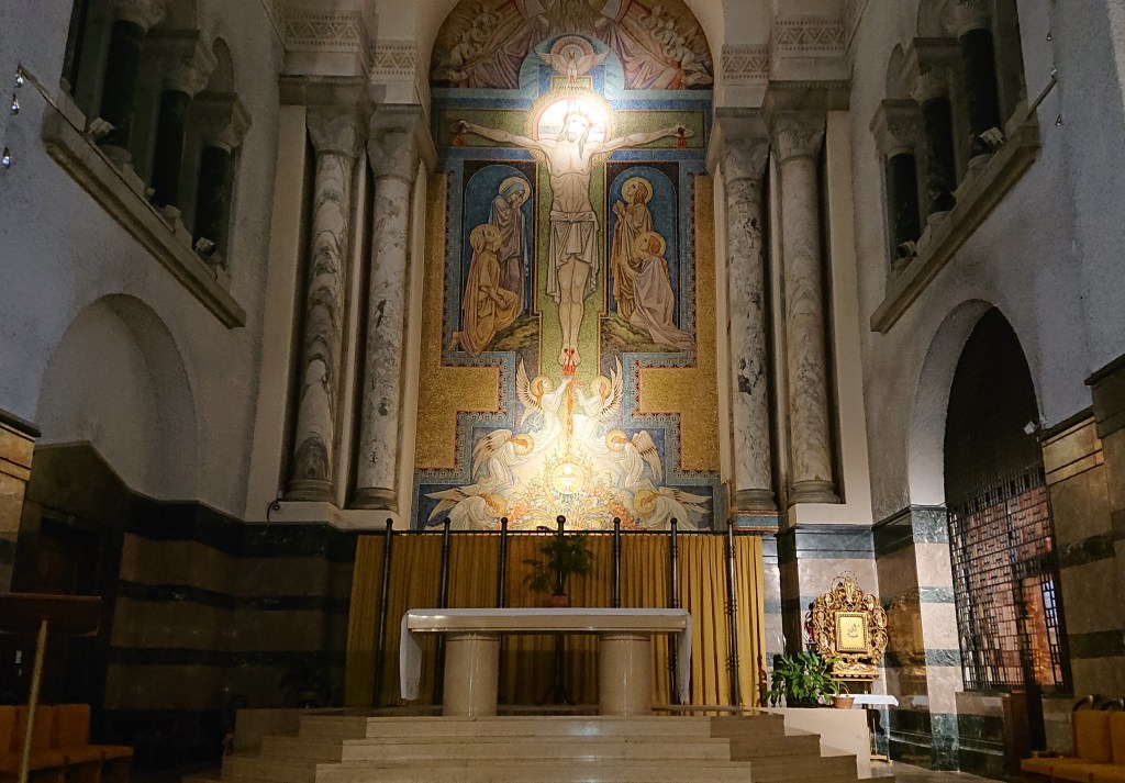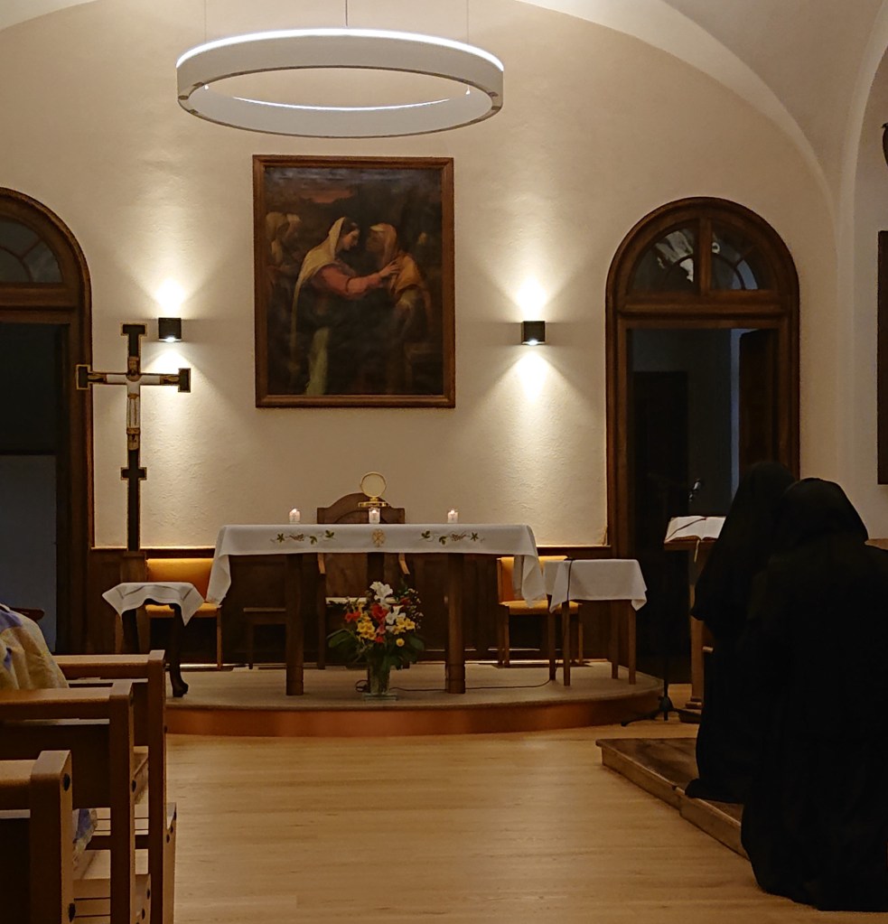 Nous entrons dans l’édifice, jusque dans la chapelle des sœurs, pour les Vêpres suivies du Salut du Saint Sacrement.