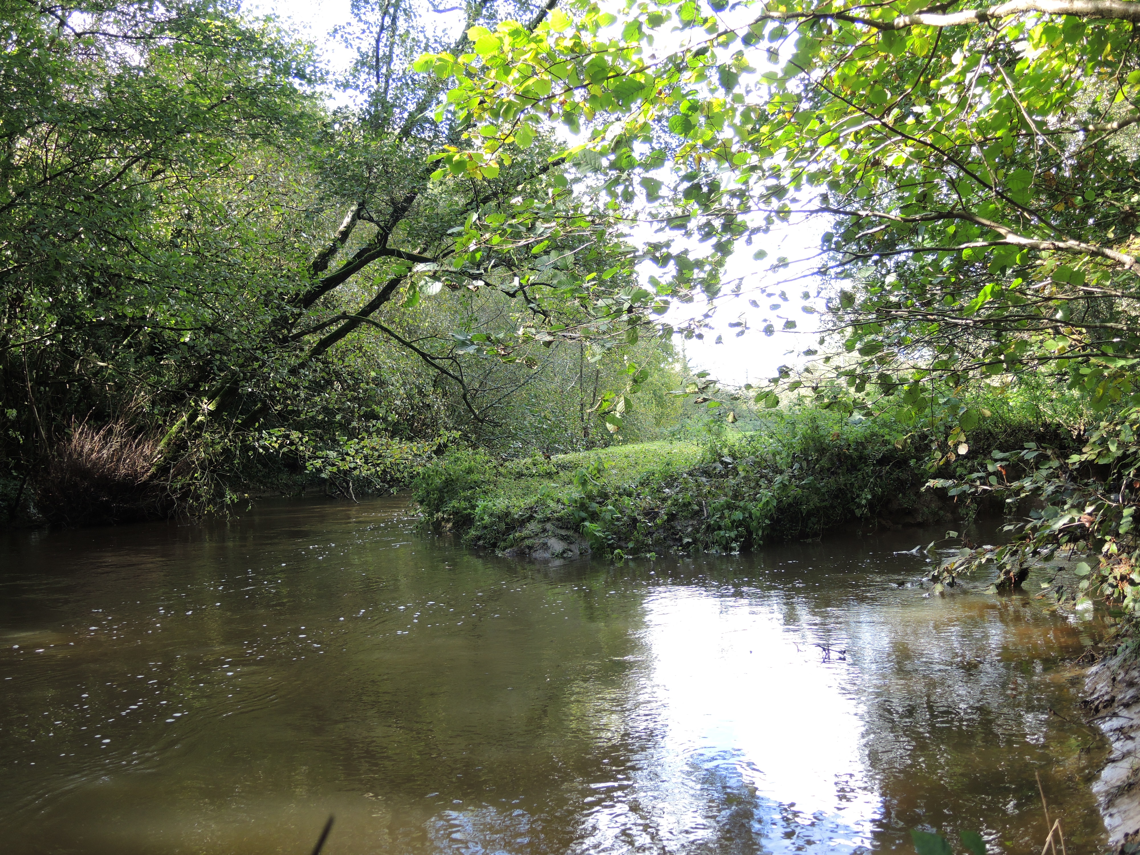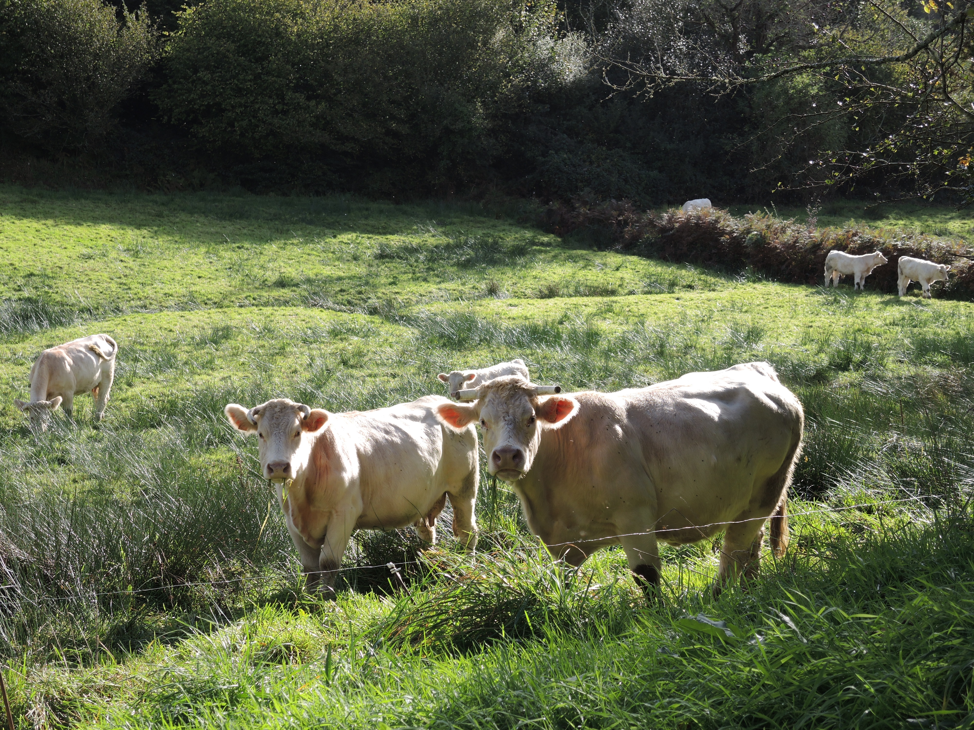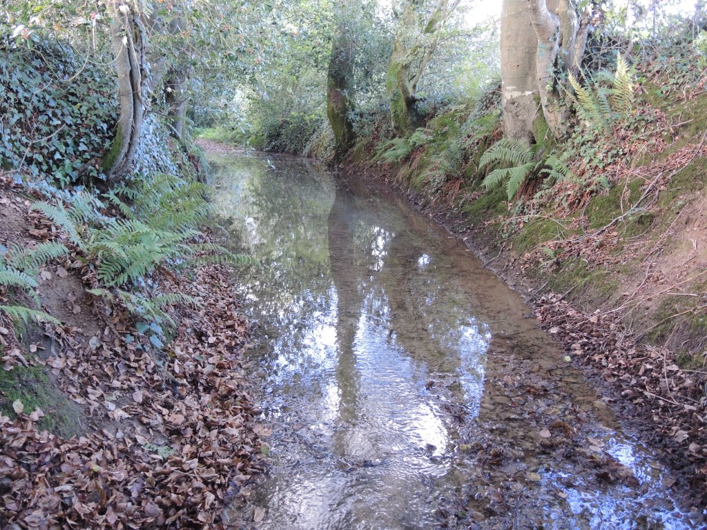 « On pouvait la franchir mais elle arrêtait le glissement de terrain » constate Tesson4 en longeant les haies. Quand le chemin se métamorphose en piscine, je franchis le talus et sa haie de ronce et de houx et finis chez les vaches qui me regardent avec leur légendaire regard bovin. Plus loin, il me faudrait une machette pour traverser la broussaille qui s’ajoute aux barbelés. Je rebrousse chemin, passe l’autre talus et rejoins le sentier les pieds au sec. Il a plu avant que je ne marche, pas pendant.