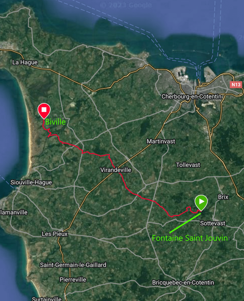 L’heure tourne et il me faut partir pour rejoindre Biville ce soir. Julien rentre en voiture, j’engloutis un sandwich et entame ma marche, confiante, pour 18km seulement. Mais ma préparation de l’itinéraire fut faite au dernier moment, me reposant sur ma longue expérience. J’ai confondu avec l’étape de demain, j’en aurai 6 de plus ce soir et je ne l’ai pas encore compris… Qu’importe, le « génie des haies » va me guider.
