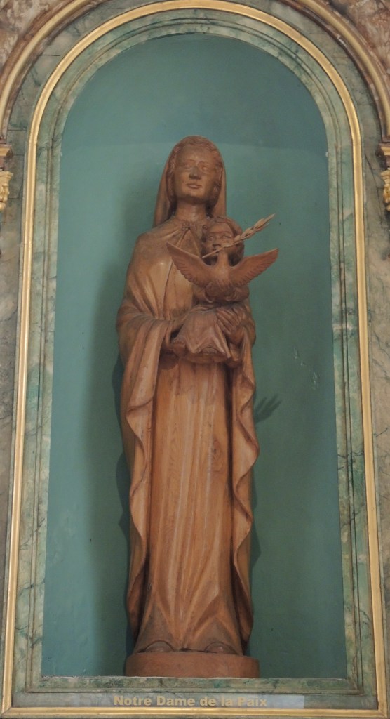 À l’entrée de l’église, un petit panneau de bienvenue, non loin de la statue de Notre Dame de la Paix, invite le visiteur à devenir « pèlerin de la paix » :
