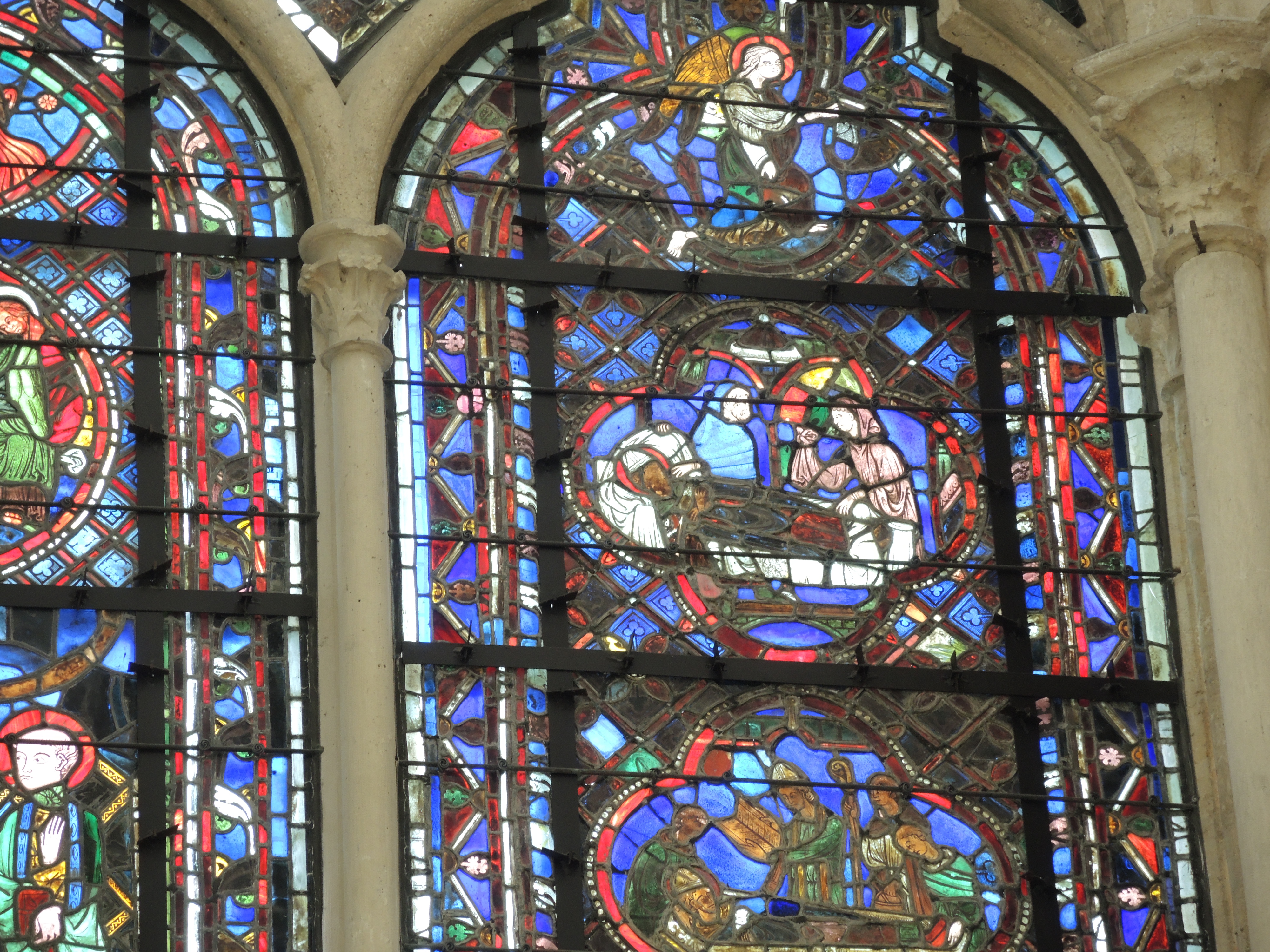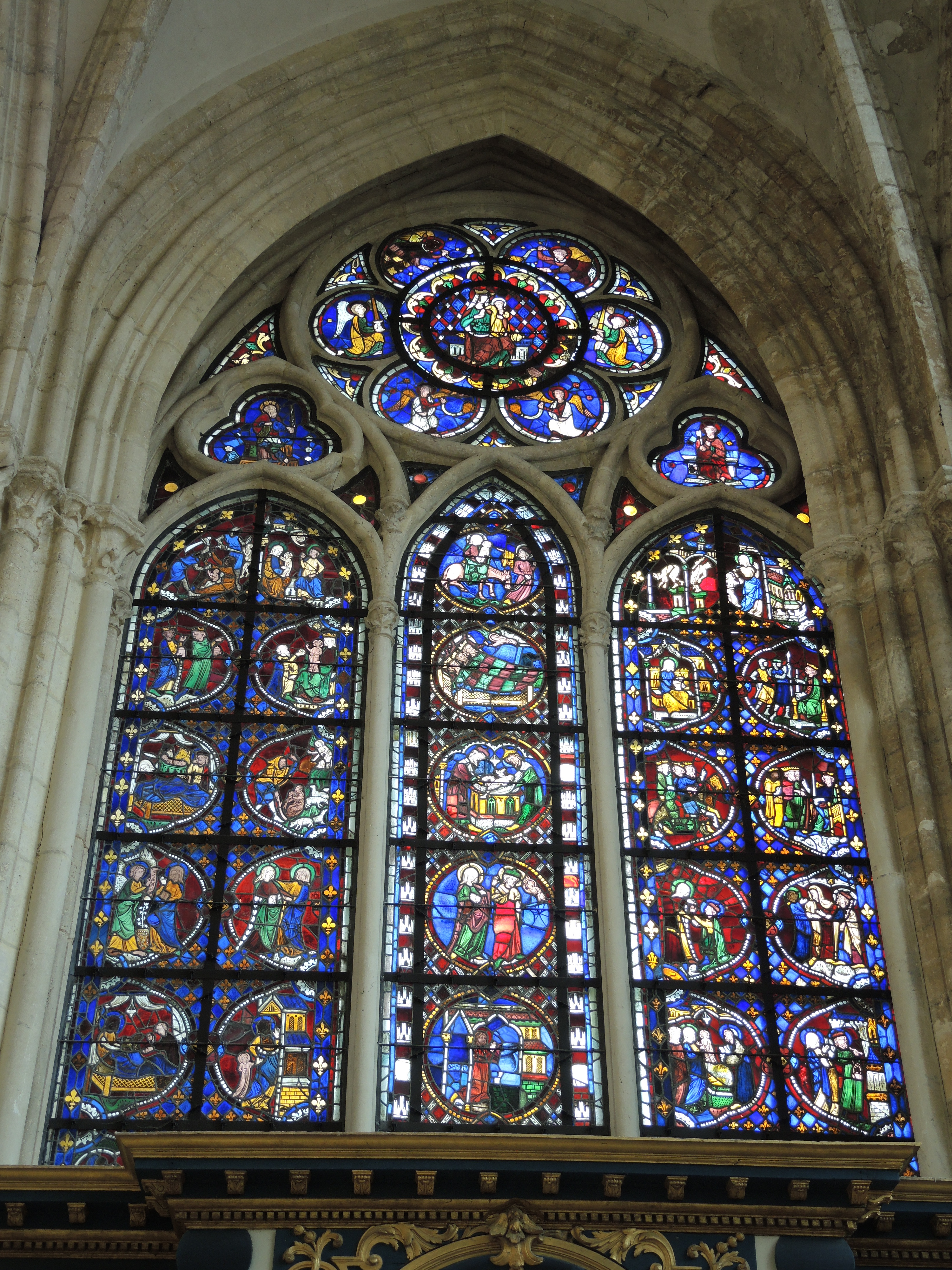Ce vitrail datant de l’époque de saint Louis a été restauré en même temps que ceux de la Sainte-Chapelle. Il raconte la naissance de la Vierge et celle de Jésus. Celui du chœur rappelle la passion du Seigneur et la mort de saint Sulpice :