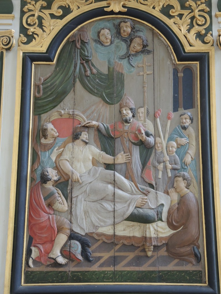 L’artiste Robert Lanz, habitant de Saint-Sulpice, a peint vers 1937 un panneau retraçant toute la vie du saint :