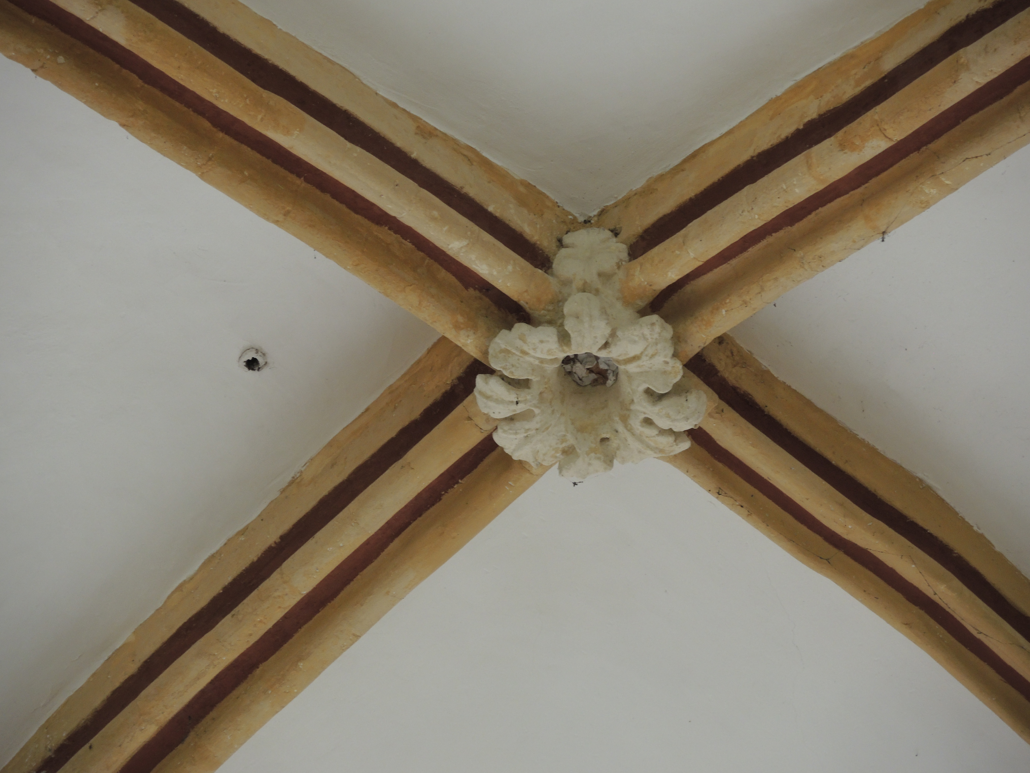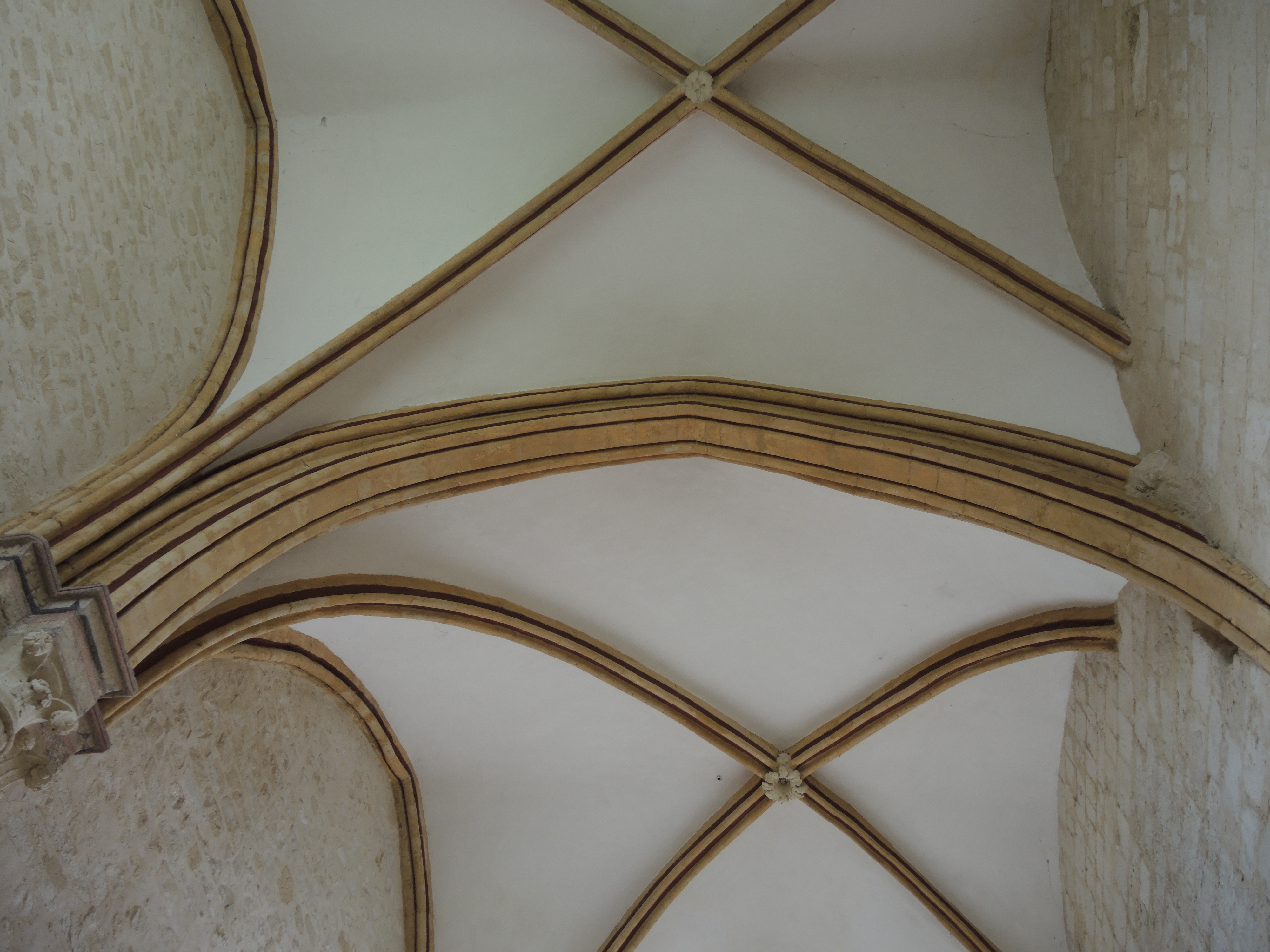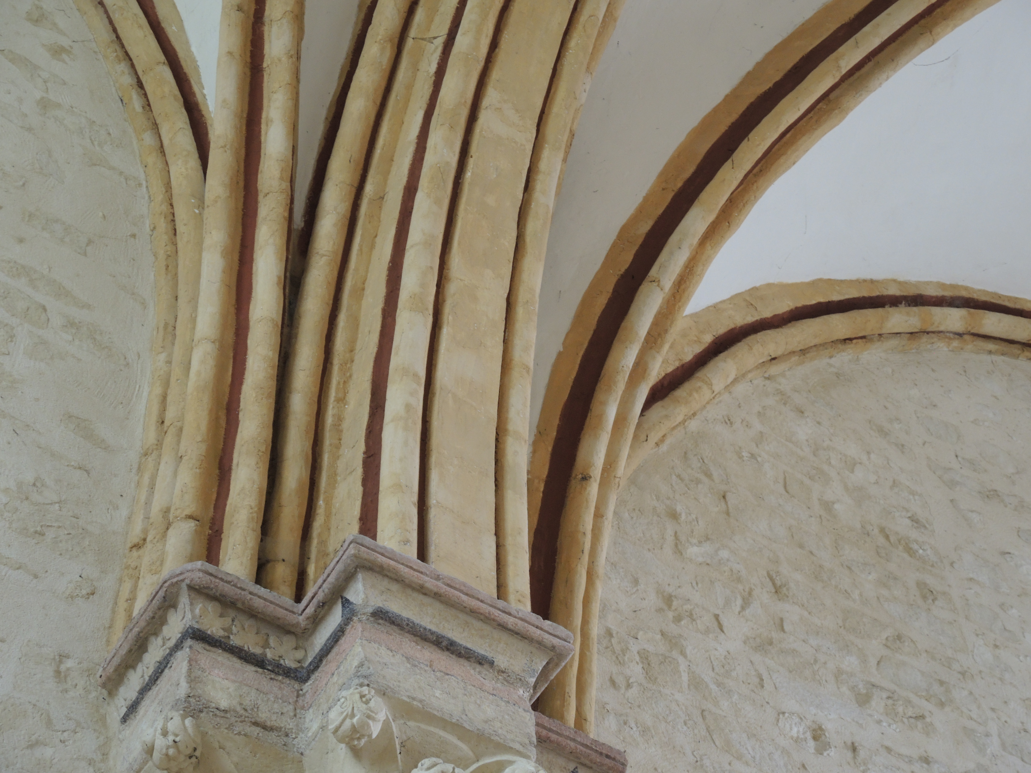 Les travaux imposants sur l’édifice ont également révélé les traces des peintures primitives du bâtiment : les églises gothiques étaient peintes et très colorées à l’origine. Ici, il a été mis en valeur la polychromie au niveau des croisées d’ogives de la chapelle :