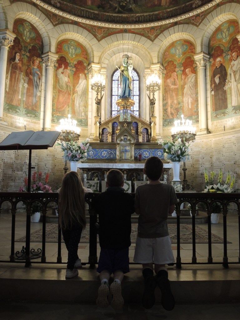 Comme à l’accoutumée, ma petite famille rejoint la maman pèlerine pour une prière (difficilement sage et recueillie) pour la France avec nos trois lionceaux vigoureux :