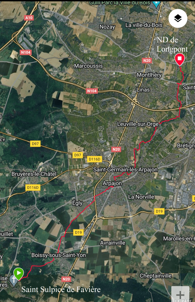 De là, j’irai, ce 20 mai 2024, vers Notre-Dame-de-Bonne-Garde à Longpont, plus au Nord, un autre lieu de pèlerinage dont l’origine se perd aux confins de l’histoire et de la légende. Un itinéraire en suivant de près ou de loin de douces rivières de l’Essonne : la Renarde, la Vidange, l’Orge, la Rémarde, la Grande Boële, la Salmouille…